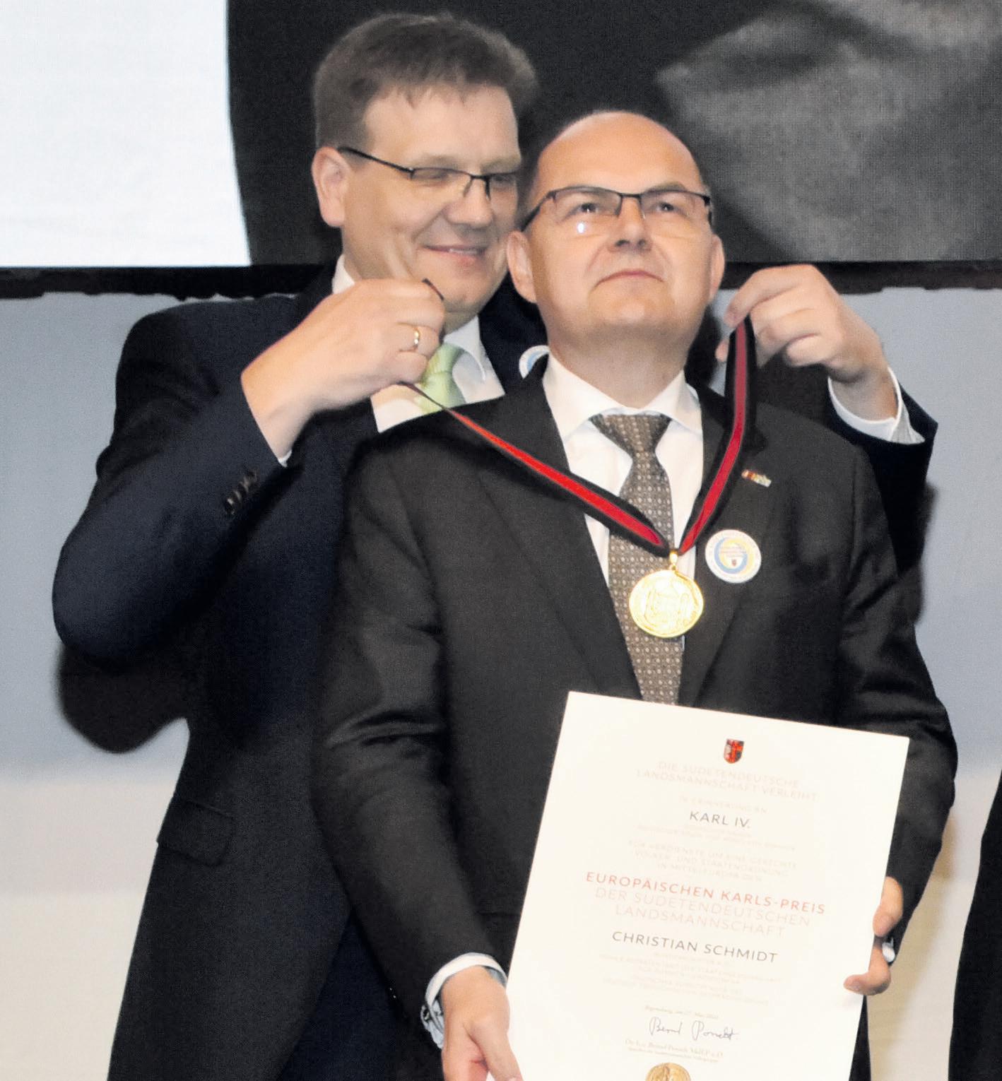 Bereits am Tag zuvor, bei der Verleihung der Karls-Preise der Sudetendeutschen Landsmannschaft, standen die deutschtschechischen Beziehungen im Mittelpunkt. Mit dem Tschechen Libor Rouček und dem Deutschen Christian Schmidt wurden, so Posselt, zwei „herausragende Brückenbauer zwischen den Völkern geehrt, die seit Jahrzehnten mit viel Fingerspitzengefühl, Mut und Nachhaltigkeit den Dialog zwischen Deutschland und der Tschechischen Republik unter führender Einbeziehung der Sudetendeutschen vorangetrieben haben“. Der ehema-