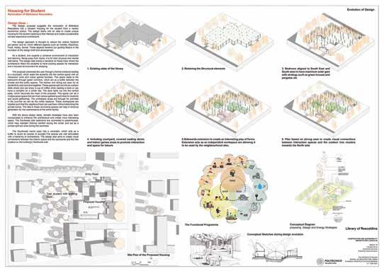 The Design proposal suggests te renovation of Biblioteca Reescaldina into a student for the student from a nearby economics school. The design starts with an idea to create unique housing for the student catering to thier lifestyle and create a sustainable climate responsive architecture.