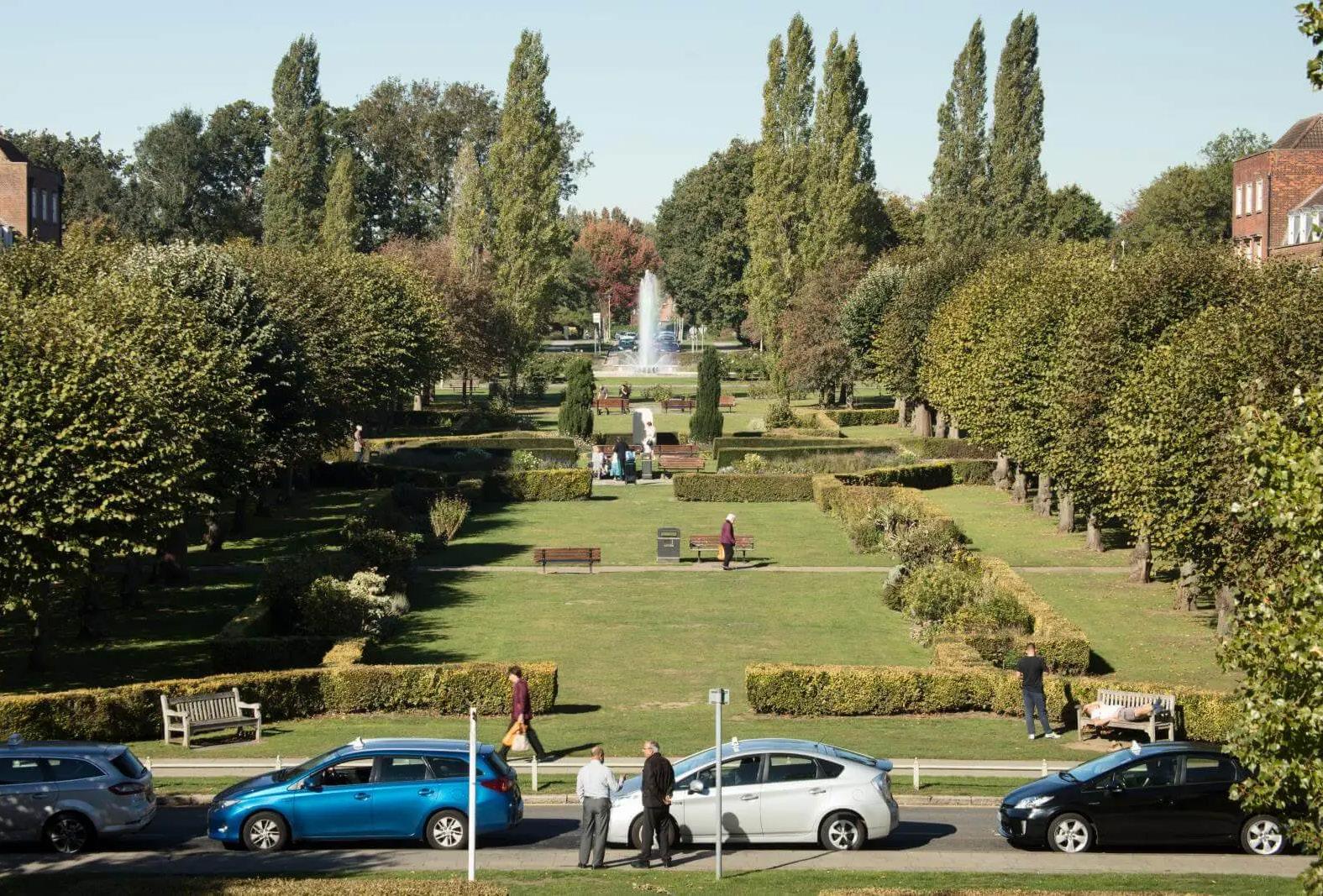 Welwyn Garden City in Hertfordshire. View along Howardsgate to Coronation Fountain from the Howard Centre