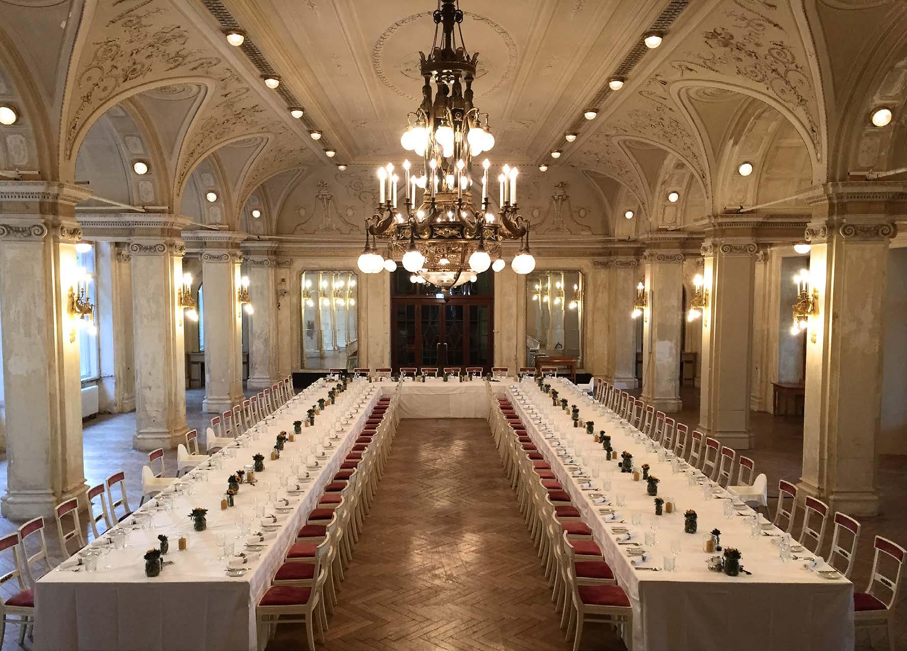 Über das Vestibül gelangen Sie in den einzigartig schönen Speisesaal, der mit seiner ellipsenförmigen Bühne, den großen Lustern, den hohen Fenstern und Spiegeln wie ein Ballsaal anmutet. Hier finden Bühnenproduktionen statt, aber auch Veranstaltungen mit Kulinarik.