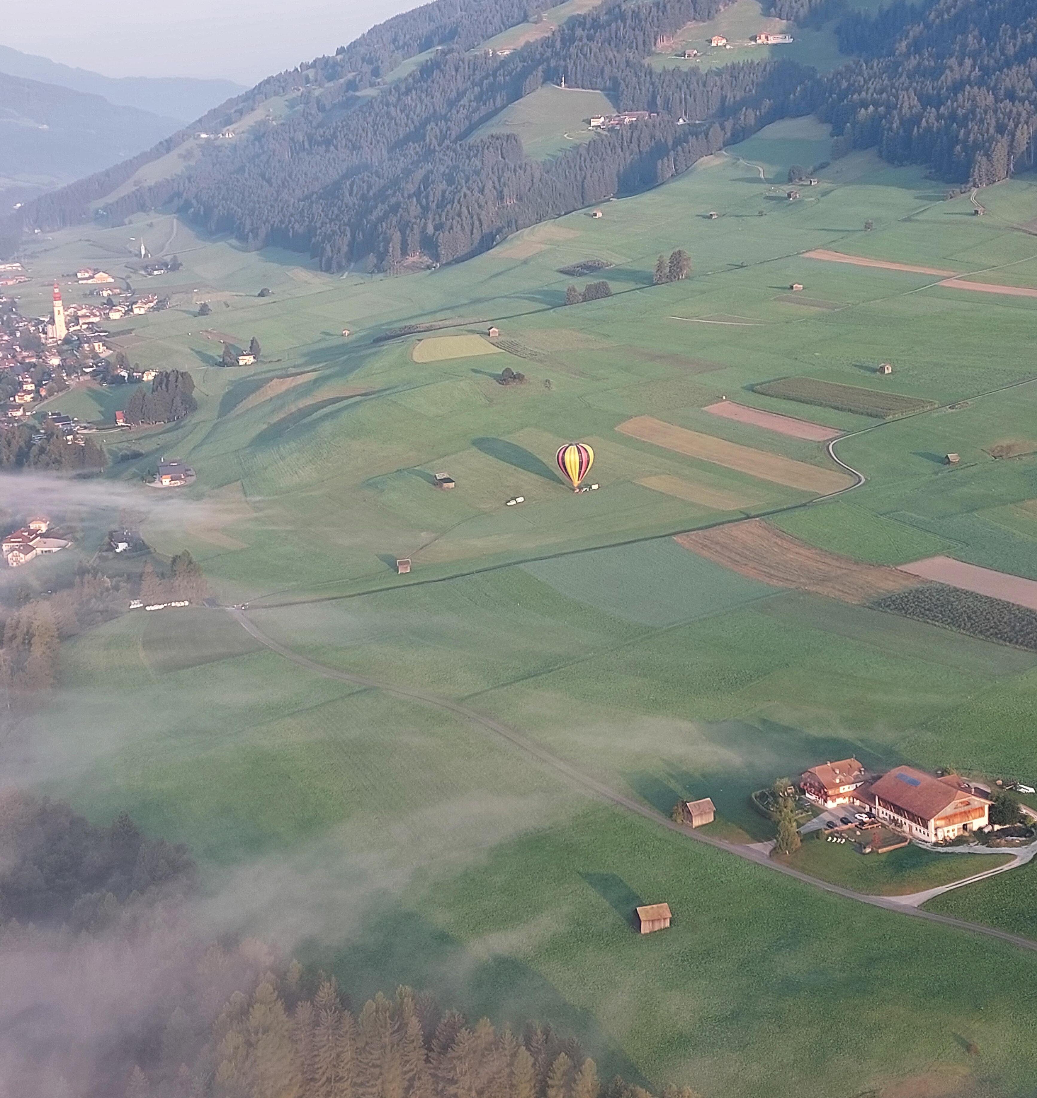 Wenn man aus dem Korb des Heißluftballons hinunterschaut, sieht man wie das Werk des Menschen mit der Natur verschmilzt, dies wirkt wie ein Kunstwerk. Ich nenne die Felder und Wiesen, die von den Bauern so fleißig gepflegt werden und von hoch oben perfekt aneinandergereiht aussehen: ‚bäuerliche Geometrien‘.