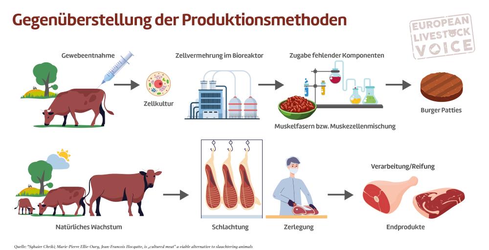 Kurz zusammengefasst, wie Laborfleisch produziert wird: Einem lebenden Kalb wird Muskelgewebe entnommen, dieses wächst in einer Nährlösung aus Zucker, Aminosäuren, Mineralien und Vitaminen sowie Wachstumsserum (Kälberserum) zu Muskelfasern heran. Diese herangewachsenen Muskelfasern kommen danach in den Fleischwolf und könnten für Burger oder Wurstwaren verwendet werden.