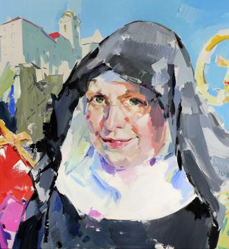 Today, women have a strong influence on Klaus- en’s art scene. Pictured: Sonya Hofer’s 2018 portrait of the abbess of Säben Ab- bey, Marcellina Pustet, as well as a piece from Astrid Gamper’s 2018 series “Hül- len” (“Layers”), in which she attempts to portray women as both vulnerable and strong.