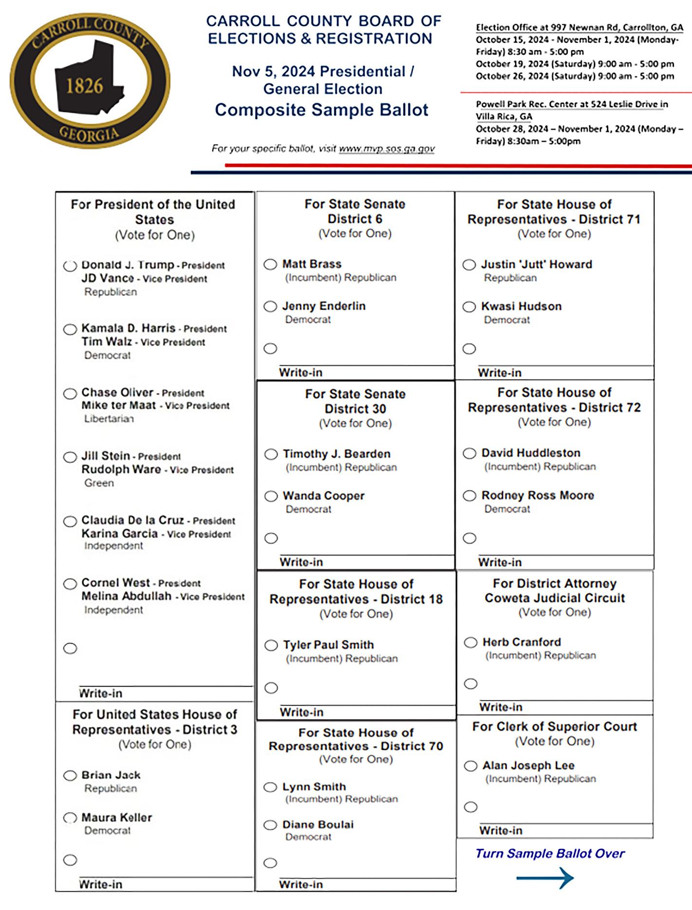 by Sue Horn Early voting will begin October 15th in Carroll County for the November 5, 2024 Presidential General Election. In addition to making a choice for president