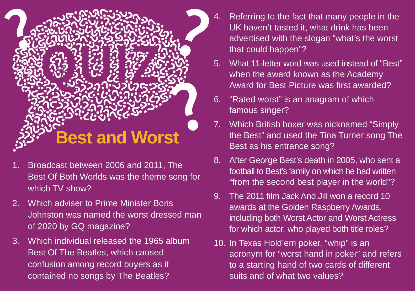 1. Hannah Montana 2. Dominic Cummings 3. Pete Best (an early member of The Beatles) 4. Dr Pepper 5. Outstanding 6. Rod Stewart 7. Chris Eubank 8. Pele 9. Adam Sandler 10. Seven and two