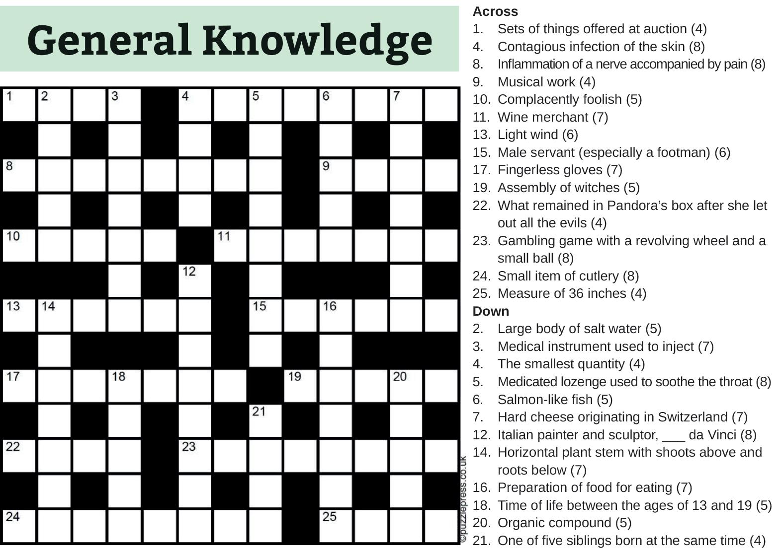Across: 1 Lots, 4 Impetigo, 8 Neuritis, 9 Opus, 10 Inane, 11 Vintner 13 Breeze 15 Lackey 17 Mittens 19 Coven 22 Hope 23 Roulette 24 Teaspoon, 25 Yard.