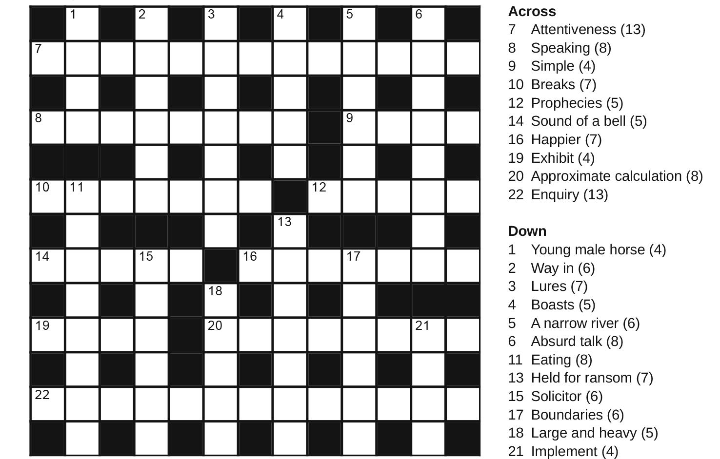 Across: 7 Concentration, 8 Uttering, 9 Easy, 10 Smashes, 12 Omens, 14 Knell, 16 Jollier, 19 Show, 20 Estimate, 22 Investigation. Down: 1 Colt, 2 Access, 3 Entices, 4 Brags, 5 Stream, 6 Nonsense, 11 Munching, 13 Hostage, 15 Lawyer, 7 Limits, 18 Hefty, 21 Tool.