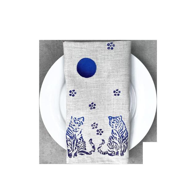 If you’ve been following along with Tulusa for a while you know that we have a love for tiger imagery. While we still are happy to print our Easy, Tiger pattern (see them in the hand towels below), during one late night studio session these sweet Tiger Twins came to life sitting under a full moon with gently falling blossoms.