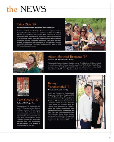 the NEWS Trina Zide ’95 Skate Park Development Teams Up with Tony Hawk On June 4 hundreds from Burlington, Vermont, came together at a local skate park to honor the memory of a well-known local DJ, Andy “A-Dog” Williams, who passed away from cancer in 2013. Trina Zide ’95, owner of Maven Skate Shop, hosted the event and was one of the original visionaries for the skate park, working closely with Burlington Mayor Mario Weinberger to make this a reality. Professional skateboarder Tony Hawk and others surprised the locals when they showed up for the dedication. The park received $10,000 from the Tony Hawk Foundation in 2010 and is the 500th THF-assisted skate park to open.