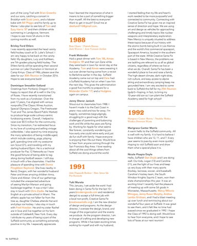 1988 Frank Molander Had a great dinner with Tom ’88, Aimee Hodgkins ’89 and their son Zane while they were back in town for revisit day at the Academy. Tom and Aimee were sweating it out over dinner having come from a revisit to Berkshire earlier in the day. Suffield Academy came out on top and Zane had a Suffield Academy hat on when I saw him the next day. This gives the administration a good five months to prepare for a Molander (Carlin ’17) and a Hodgkins again on campus. Jenny Sherer Janisch Shout-out to classmates from 1988. I haven’t made it to the East Coast in years—too cold and too far away. I’m happily, sometimes begrudgingly, struggling (in a good way) with the challenges of parenting and balancing work and life while the years are flying by. Working for Apple for what seems like forever, constantly wondering just how early one could retire early and just do fun stuff with family. Hope everyone is enjoying their life out there. Would love to hear from anyone coming through the San Francisco Bay Area. I love reading about all the cool things others from Suffield are doing around the world.