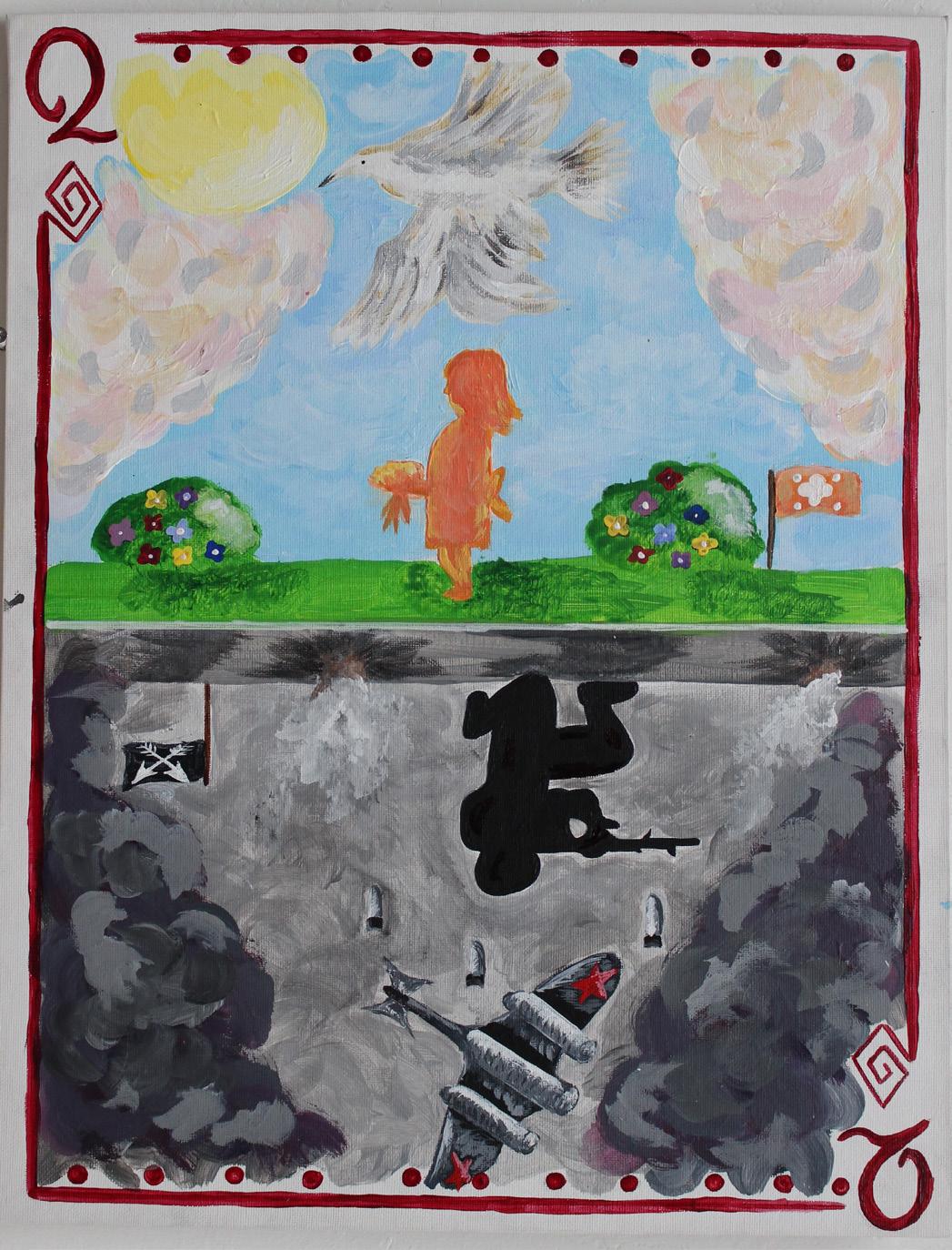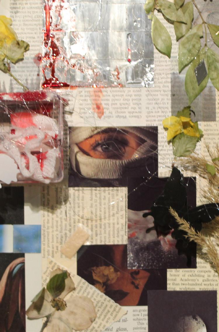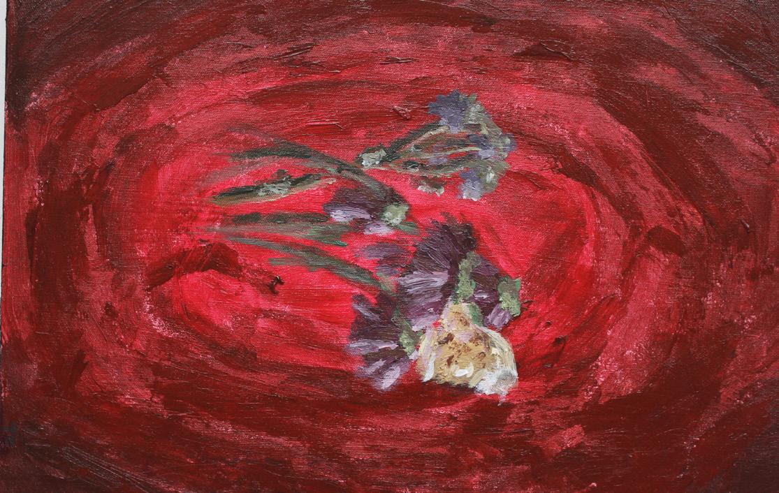intensity. Plates crashed against one another, shattering into piles of rubble. Broken glass compiled deep into my skin and the cacophony of debris shattering onto the floor all fell in a silent manner. The heart of one shattered in a silent manner. The beat of it augments. The pipes exploded with water; the bitter taste of droplets triggered the rise of goosebumps along my arms. The faded maroon plaster chipped off the walls, revealing the vulnerability beneath. The feathers fled out of the pillows, swirling in a desperate dance of freedom. Picture frames plunged down, consumed by flames that ignited from the embers carried by grey smoke. The ground rumbled tumultuously as if Hades’s heart had been broken once more. Our bodies trembled in confusion and terror. I felt a mixture of oil and vinegar replacing the blood coursing through my veins.