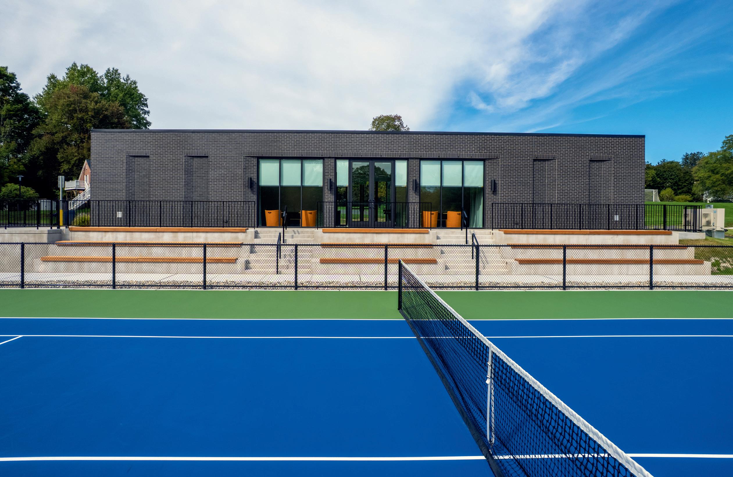 Additionally, construction was completed earlier this year on the new tennis and golf center, which replaced the ten tennis courts with twelve new ones, and added a 2,500-square-foot building. The facility includes a central lounge that opens onto the courts, restrooms, and two 3-dimensional activity spaces with golf simulators. It was designed by architect Andrew Kotchen ’90, P’22, ’26 and his firm, Workshop/APD. The tennis and golf center was funded entirely through gifts to Suffield.