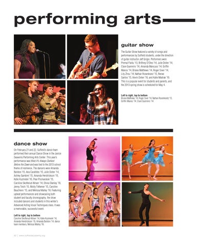 performing arts guitar show The Guitar Show featured a variety of songs and performances by Suffield students, under the direction of guitar instructor Jeff Grigio. Performers were Premal Faldu ’13, Brittney D’Oleo ’14, Julie Doten ’14, Clare Guerreiro ’14, Amanda Mancuso ’14, Griffin Manos ’14, Briana Matthews ’14, Roger Siver ’14, Lily Zhou ’14, Nathan Rosenkranz ’15, Renee Santos ’15, Kevin Doten ’16, and Katie Madrak ’16. This is a popular event for students and parents, and the 2013 spring show is scheduled for May 4.