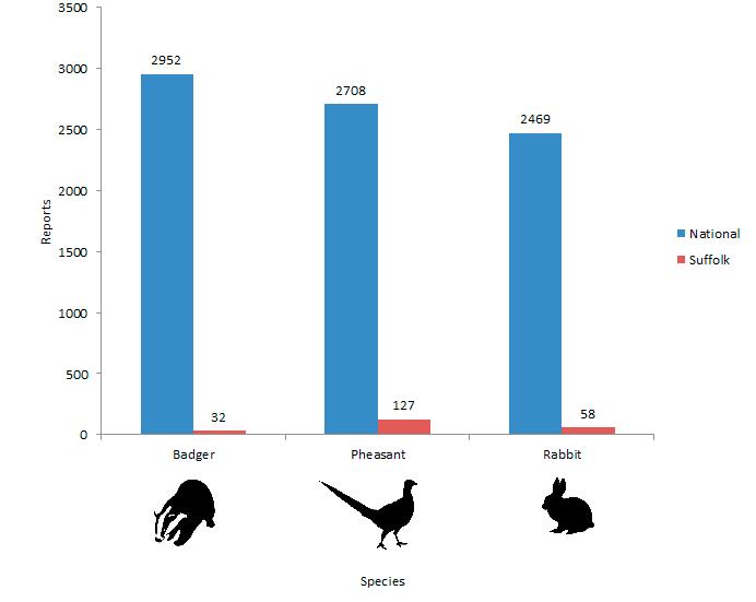 Figure 2: Top three wildlife roadkill species reported to Project Splatter by members of the public January 2013 – May 2016 both nationally and in the county of Suffolk.