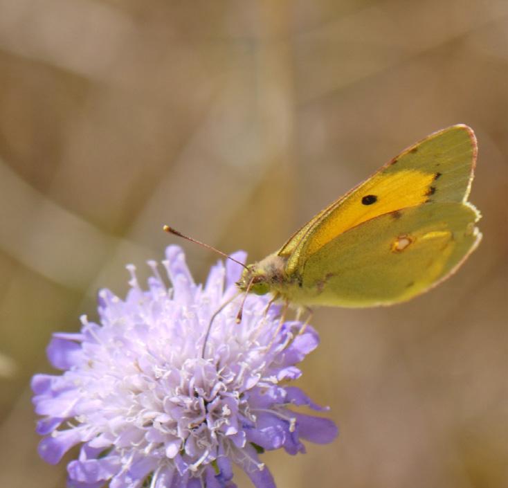 Brimstone has a characteristic ‘leaf’ shaped wing as opposed to the Clouded yellow rounded wing and in flight the Clouded yellow normally appears a darker yellow with visible black wing markings. Female Brimstones are paler and can be overlooked as ‘Whites’. Brown Argus is usually identified by its small size. The female