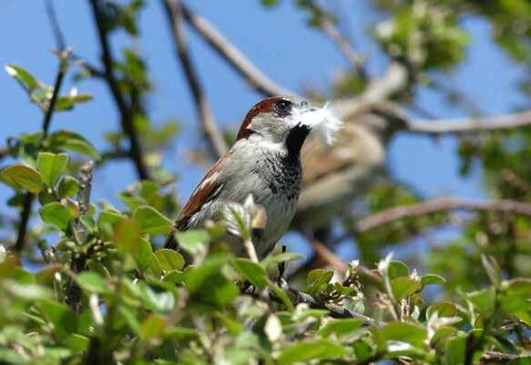 made use of a variety of resources and I watched as one bird swooped across to skilfully catch a floating feather in flight. During the nesting season they also hop on to the grass and I’ve noted that they will not only take dry, cut stems of grass but will also deliberately snip off fresh, green blades. They seem to like to drink regularly so water is put out for them where they also bathe. Nearby is a pile of dust, remnants of an old ant’s nest where after wet weather they build upwards, which the Sparrows also enjoy. A couple of other things I’ve noted that shows they are an intelligent species: they are alert and have a quick reaction time. Any time a Blue Tit or Blackbird makes an alarm call they immediately dive for cover. What I have found funny is that sometimes the alarm is