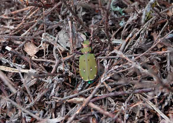 in a pine tree right above us, however we failed to see it. Moving more into the centre of the heath we heard a second Common Redstart which this time we located and had good views. Whilst in this area we also had excellent views of both a male and two female Sparrowhawk in courtship display, a Hobby on two occasions and up to four Common Buzzards. Making our way back we noted two Jays, then a Kestrel and finally a Red Kite over the MOD land. The heath also holds a number of insects and it is good to note these as well so, although relatively common, Minotaur and Green Tiger Beetle were added to the list of observations. Surprisingly we failed to see Stonechat, Woodlark and had only a brief glimpse of a Dartford Warbler.
