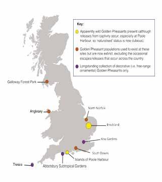 (especially Furzey Island) and at a single site in Breckland do potential ‘wild’ populations persist. Despite this, releases have occurred at both sites, and the pheasants also receive supplementary feeding. The Poole Harbour population is more obviously ‘managed’, with introductions being fairly regular. In Breckland, there are still occasional claims that the birds there today might descend from the ‘original’ naturalised population which peaked in size during the midtwentieth century. These claims relate to a Suffolk location claimed to have 20-30 individuals. We call this place ‘Site A’ for the purposes of our research, because it is on private land and the birds are very sensitive to disturbance. Other than this, single Golden Pheasants continue to turn up, from time to time, in various sites around Breckland.