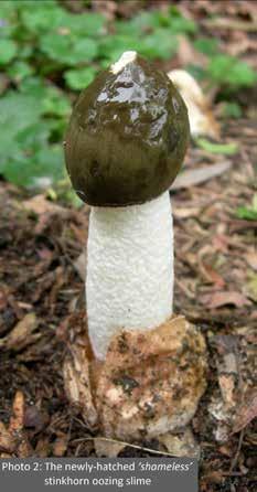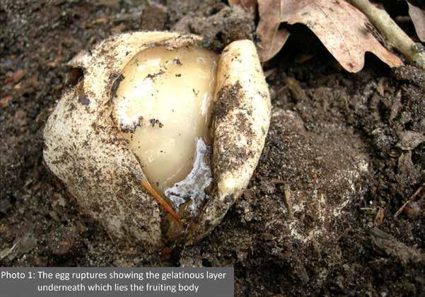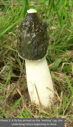 A few were half - submerged, spherical and resembling pinkish white eggs some 4-5 cm across while a couple had burst showing the gelatinous mass under the skin of the volval sac (Photo 1). Some had recently ‘expanded’, the hollow and somewhat spongy stalk fresh and white and the dark olive-green bell - shaped cap not quite glistening. I reliably use the word ‘expanded’ and not growth (which would not be conceivable) because the whole structure can form very rapidly. The emergence and extension of the fruiting body has been measured at 10–15 cm in an hour!