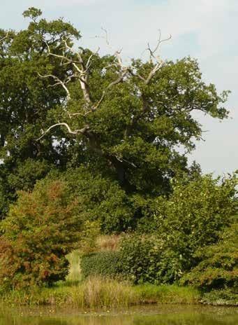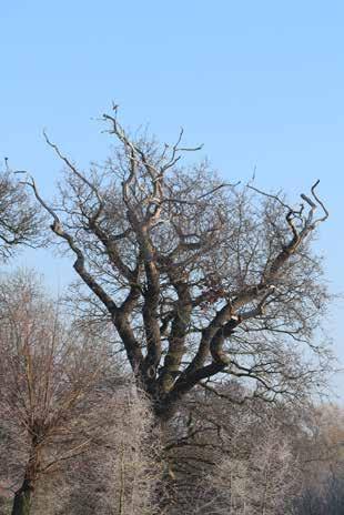 oak’s highest bare branches and great spotted woodpecker like to drum on the hollow parts making quite a din at times. In the winter (see photo), a stock dove is perched on the tree top while a barn owl sits in its nest hole (a white dot low on the right-hand side).