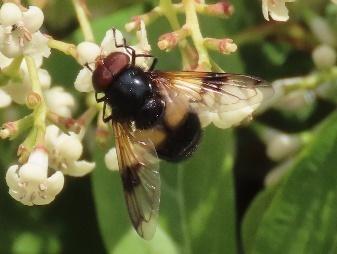 Another group of large distinctive hoverflies belong to the genus Volucella. This group only has 5 species. The Great Pied Hoverfly (Volucella pellucens) is one of the commonest and is often seen on bramble and umbellifers between May and October.