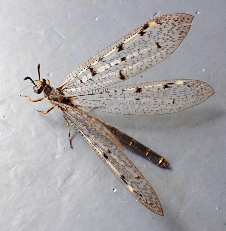 The Ant Lion, Euroleon nostras, arrives from Europe and sets up small breeding populations in suitable locations. It has become well established in the Suffolk Sandlings over the last 30 years or so. Its larvae feed on ants falling down the steep sided pits it builds in sandy soils.