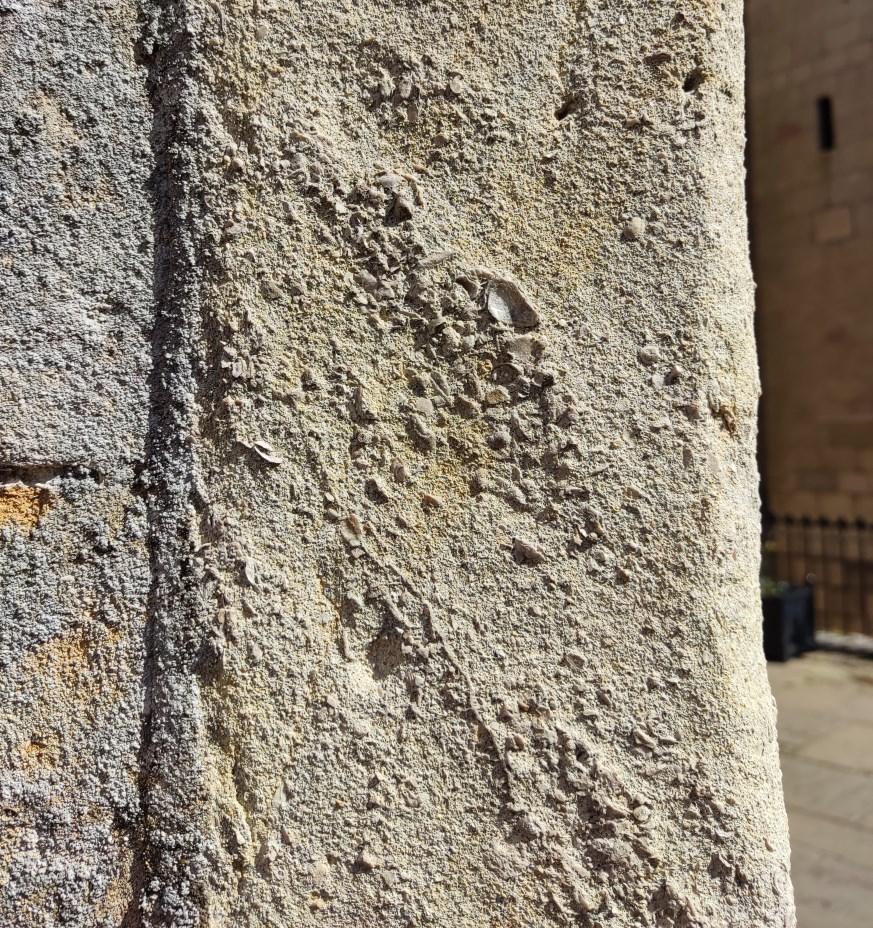 Clipsham Stone, a limestone, with fragments of fossil shells, in the southwest exterior of the Cathedral.