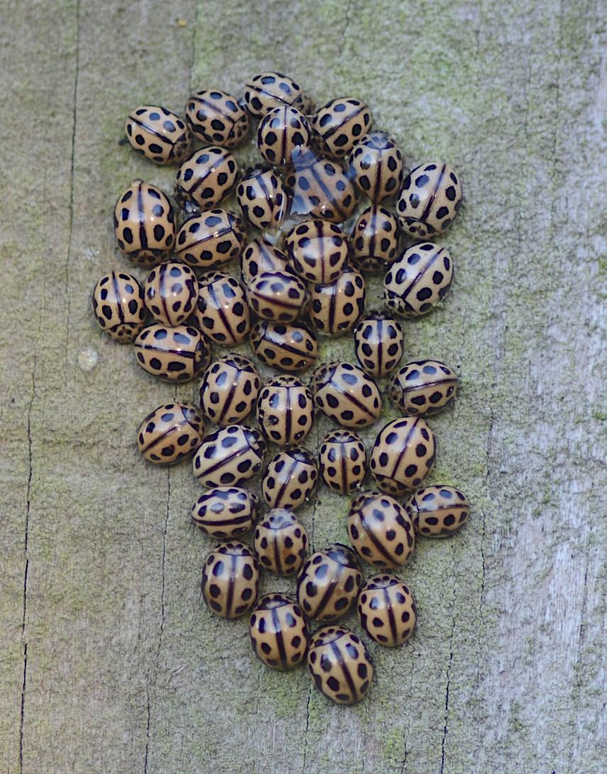 The Harlequin Ladybird, Harmonia axyridis, is an invasive species. It moved west across Europe to arrive in Great Britain around 2004. It is now well established, often abundant and topped up regularly, particularly in the south eastern part of the country. It is very variable in appearance. Its diet is less conservative than most native Ladybirds.