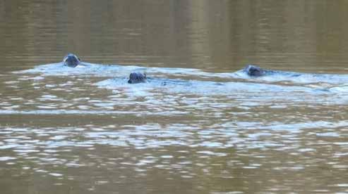 What surprised me was that each dive generated a sea of bubbles both as a result of air escaping from the nostrils and mouth but also which may have got trapped in the fur. As I watched, they gradually moved away northwards but still continuing to heave, plunge and resurface, raising their heads to deal with the caught fish. As they neared the edge of the lake at the far end, their behaviour changed, now only their heads showing above the water as they swam towards their temporary (their territories can easily range over 10 miles!) destination, the overgrown bank, and soon out of sight. But the encounter with this raft of otters will forever remain imprinted in my mind!