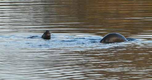 the east side of Gibbonsgate Lake (TM079329). But it was when I turned right to make my way to the Longhurst Hide that I saw three bobbing heads amongst a sea of waves they were creating. Surely not dogs! But as I went into the hide for an unobstructed view and looked through the cinemascopic slot, right away the penny dropped. Otters! Amazing!