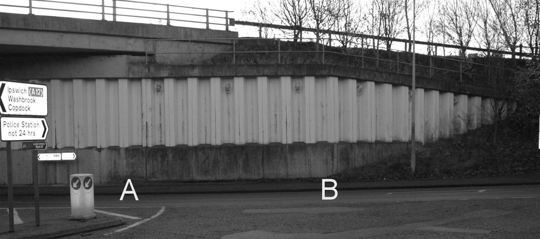 At various times over the last two years, a short stretch of pavement in Capel St Mary has been littered with up to seven dead bodies of voles and mice, at different stages of decomposition. Curiously, this stretch of pavement is only about 30 feet long and is shown in the photograph below. It is difficult to avoid the conclusion that the unfortunate mammals have fallen to their deaths over the parapet above and it is quite striking the I have never seen a corpse so much a one foot to the right of point B – they all lie between points A and B.