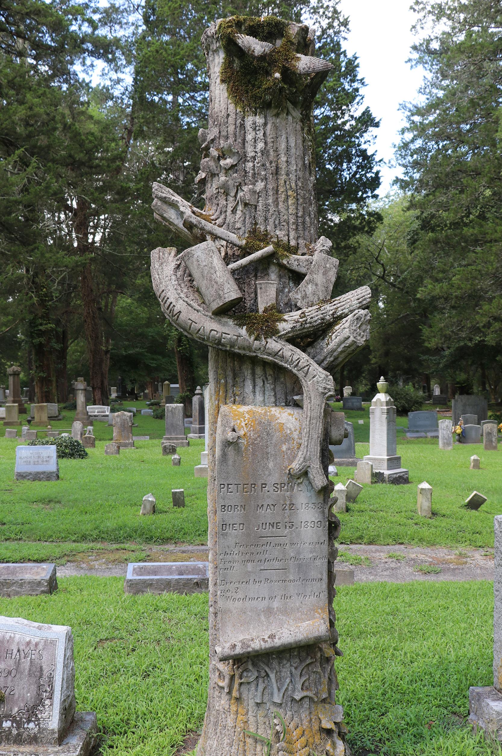 The monument of Ida J. Whaley Parker, who died at age 26, is one of the most beautiful—trunk of a tree with its anchor, broken limb, ivy, and fern. The anchor was used by early Christians as a disguised cross.