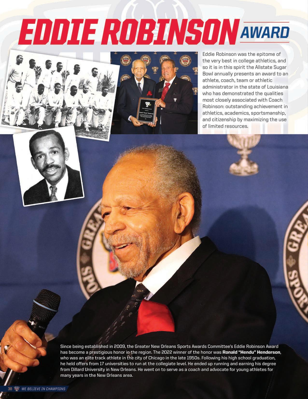Photo Credits: Colston (New Orleans Saints), Hobley (Harlem Globetrotters), King (Getty Images), Upshaw (Times-Picayune), Wright (Wright Family), Brignac (Louisiana Athletics), Manning (Sugar Bowl Archives), Robinson (Eddie Robinson Museum), McAlister (New Orleans Saints), Clark (Mississippi State Athletics), Tappin (Getty Images), Faulk (Los Angeles Rams).