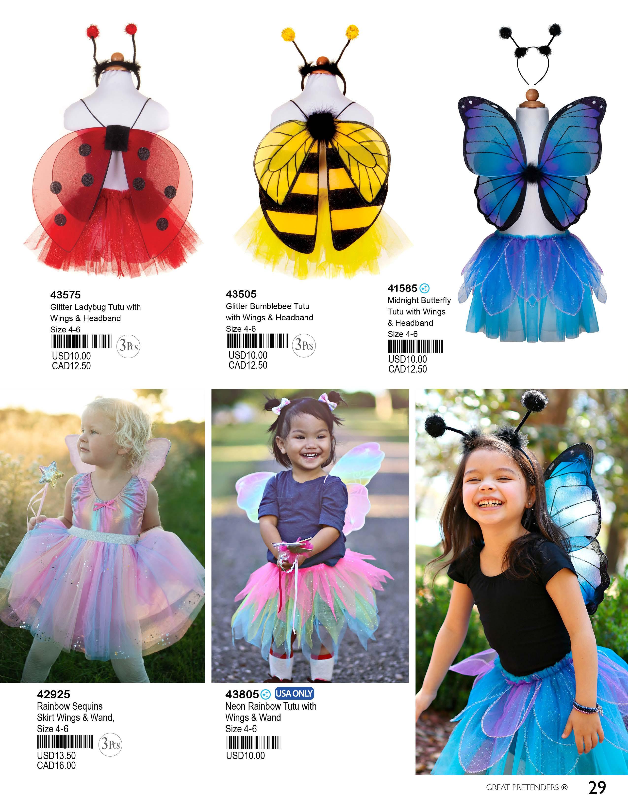 43575 Glitter Ladybug Tutu with Wings & Headband Size 4-6 l~~l~l~~l!~illll 1111111@ CAD12.50 RainbowSequins SkirtWings& Wand, Size4-6 l~~l~l~l~l!~illllllllll@ CAD16.00 43505 Glitter Bumblebee Tutu with Wings & Headband Size 4-6 11~1~~~1~!1~~11111111 II@ CAD12.50 NeonRainbowTutuwith Wings& Wand Size4-6 111111111111111111111111111111 USD10.00 41585@ Midnight Butterfly Tutu with Wings & Headband Size 4-6 111111111111111111111111 IIIIII USD10.00 CAD12.50 GREATPRETENDERS® 29