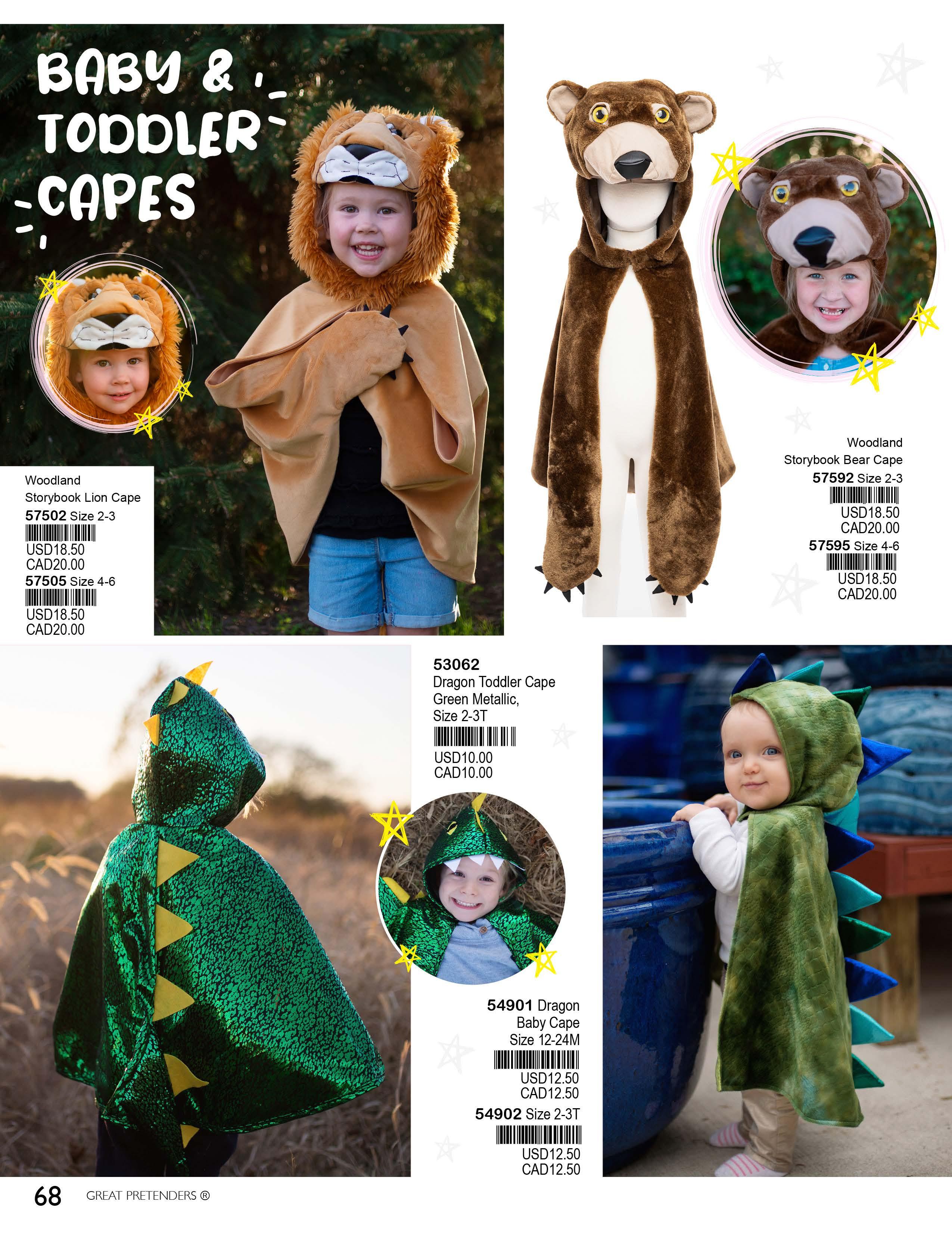 StorybookLion Cape 57502 Size 2-3 111111111111111111111111111111 USD18.50 CAD20.00 57505 Size 4-6 111111111111111111111111111111 USD18.50 CAD20.00 68 GREATPRETENDERS® 53062 DragonToddlerCape GreenMetallic, Size2-3T 111111111111111111111111111111 USD10.00 CAD10.00 54901 Dragon BabyCape Size12-24M 111111111111111111111111111111 USD12.50 CAD12.50 54902 Size2-3T 111111111111111111111111111111 USD12.50 CAD12.50 Woodland StorybookBear Cape 57592 Size 2-3 111111111111111111111111111111 USD18.50 CAD20.00 57595 Size 4-6 111111111111111111111111111111 USD18.50 CAD20.00