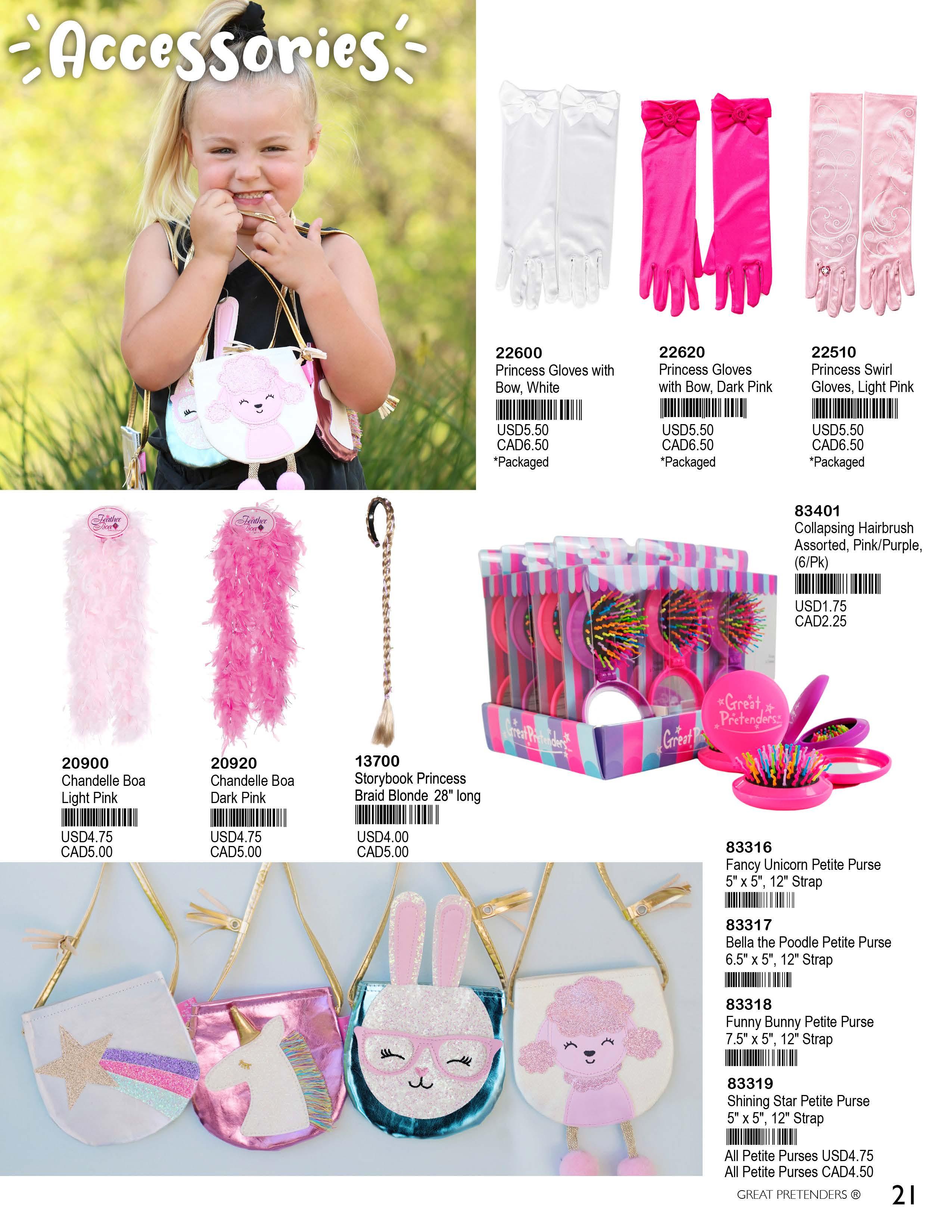 20900 ChandelleBoa LightPink 111111111111111111111111111111 USD4.75 CAD5.00 20920 ChandelleBoa DarkPink 111111111111111111111111111111 USD4.75 CAD5.00 13700 StorybookPrincess BraidBlonde28" long IIIIIIIIIIIIIIIIIIIIIIIIIIIIII USD4.00 CAD5.00 • I I ' 22600 PrincessGloveswith Bow,White 1111111111111111111111 IIIIIIll USD5.50 CAD6.50 *Packaged Y"-- ,,......, 22620 22510 PrincessGloves withBow,DarkPink PrincessSwirl Gloves,LightPink 1111111111111111111111 IIIIIIII 111111111111111111111111111111 USD5.50 CAD6.50 *Packaged USD5.50 CAD6.50 *Packaged 83401 CollapsingHairbrush Assorted,Pink/Purple, (6/Pk) 83316 111111111111111111111111111111 USD1.75 CAD2.25 FancyUnicornPetitePurse 5" x 5", 12"Strap 111111111111111111111111111111 83317 Bellathe PoodlePetitePurse 6.5"x 5", 12"Strap 111111111111111111111111111111 83318 FunnyBunnyPetitePurse 7.5"x 5", 12"Strap 111111111111111111111111111111 83319 ShiningStarPetitePurse 5" x 5", 12"Strap 111111111111111111111111111111 All PetitePursesUSD4.75 All PetitePursesCAD4.50 GREATPRETENDERS® 21