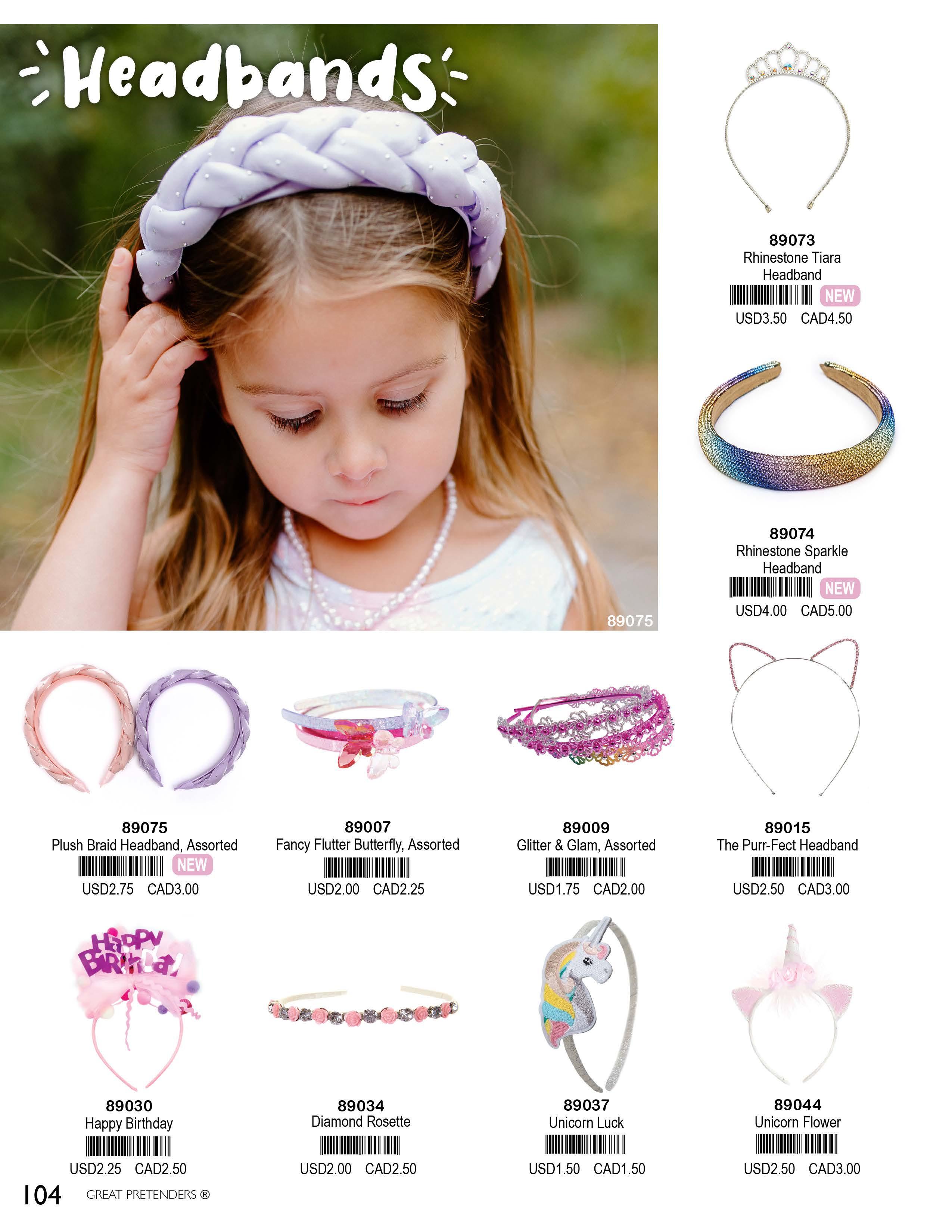 89075 89007 PlushBraidHeadband,Assorted FancyFlutterButterfly,Assorted 11111111111111111I IIIII IIIII II £Im 111111111111111111 IIIIIII IIIII USD2.75 CAD3.00 USD2.00 CAD2.25 89030 HappyBirthday 111111111111111111 IIIII IIII Ill USD2.25 CAD2.50 I 04 GREATPRETENDERS® 89034 DiamondRosette 111111111111111111111111111111 USD2.00 CAD2.50 89009 Glitter& Glam,Assorted 111111111111111111111111111111 USD1.75 CAD2.00 89037 UnicornLuck 111111111111111111111111111111 USD1.50 CAD1.50 89073 RhinestoneTiara Headband 111111111111111111111111111111 £Im USD3.50 CAD4.50 89074 RhinestoneSparkle Headband 11111111111111111111111111111I £Im USD4.00 CAD5.00 89015 ThePurr-FeetHeadband 11111111111111111111111111111I USD2.50 CAD3.00 89044 UnicornFlower 11111111111111111111111111111I USD2.50 CAD3.00