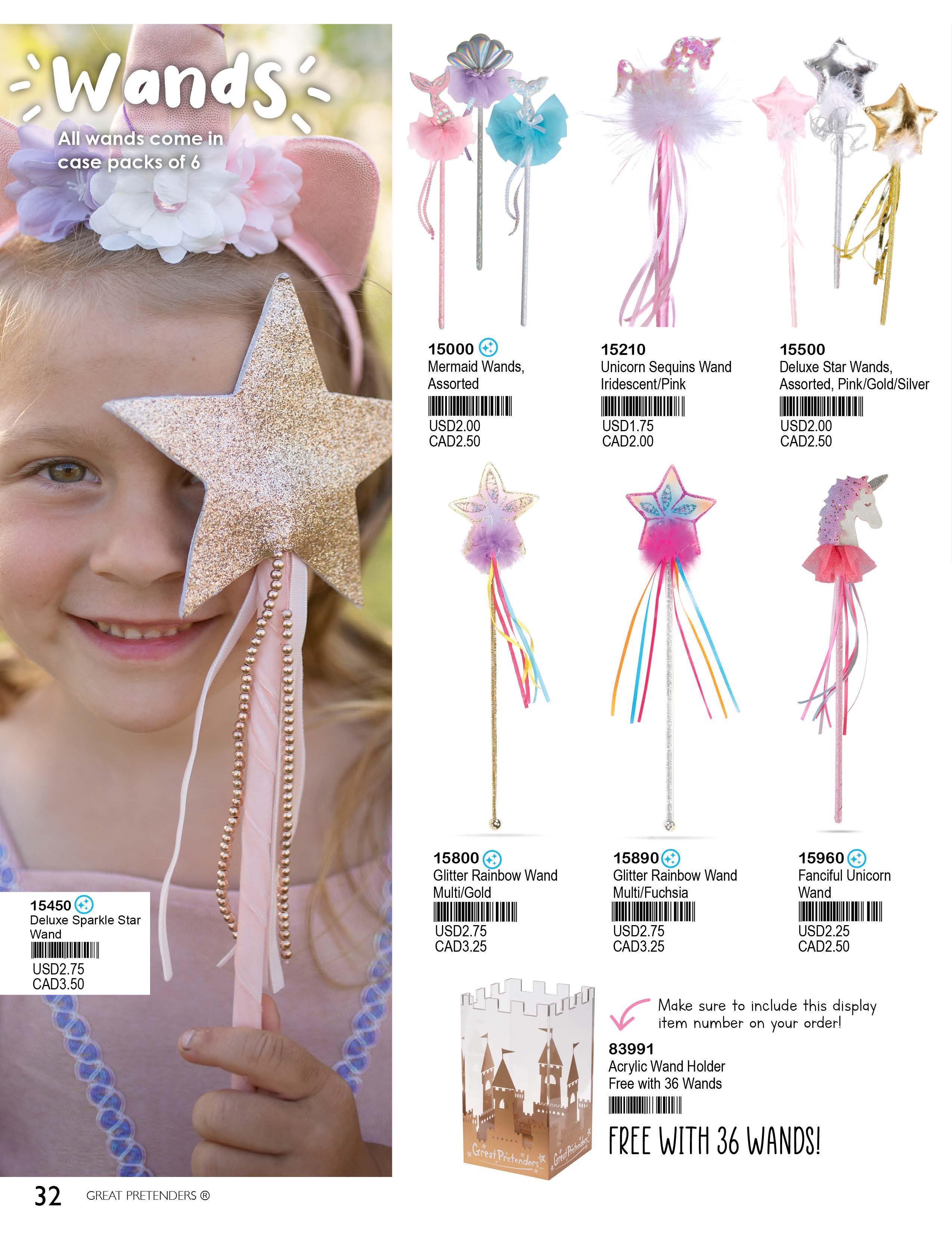 15450@ Deluxe Sparkle Star Wand 111111111111111111111111111111 USD2.75 CAD3.50 32 GREATPRETENDERS® 15000@ MermaidWands, Assorted 111111111111111111111111111111 USD2.00 CAD2.50 15800@ GlitterRainbowWand Multi/Gold 1111111111111111111111 IIIIIIII USD2.75 CAD3.25 15210 UnicornSequinsWand Iridescent/Pink 1111111111111111111111111111 II USD1.75 CAD2.00 15890@ GlitterRainbowWand Multi/Fuchsia 1111111111111111111111 IIIIIIII USD2.75 CAD3.25 15500 DeluxeStarWands, Assorted,Pink/Gold/Silver 111111111111111111111111111111 USD2.00 CAD2.50 15960@ FancifulUnicorn Wand 111111111111111111111111 IIIIII USD2.25 CAD2.50 r Mdke sure to include this displdy \/I' item number on your orderl 83991 AcrylicWandHolder Freewith36 Wands 111111111111111111111111111111 FREEWITH36WANDS!