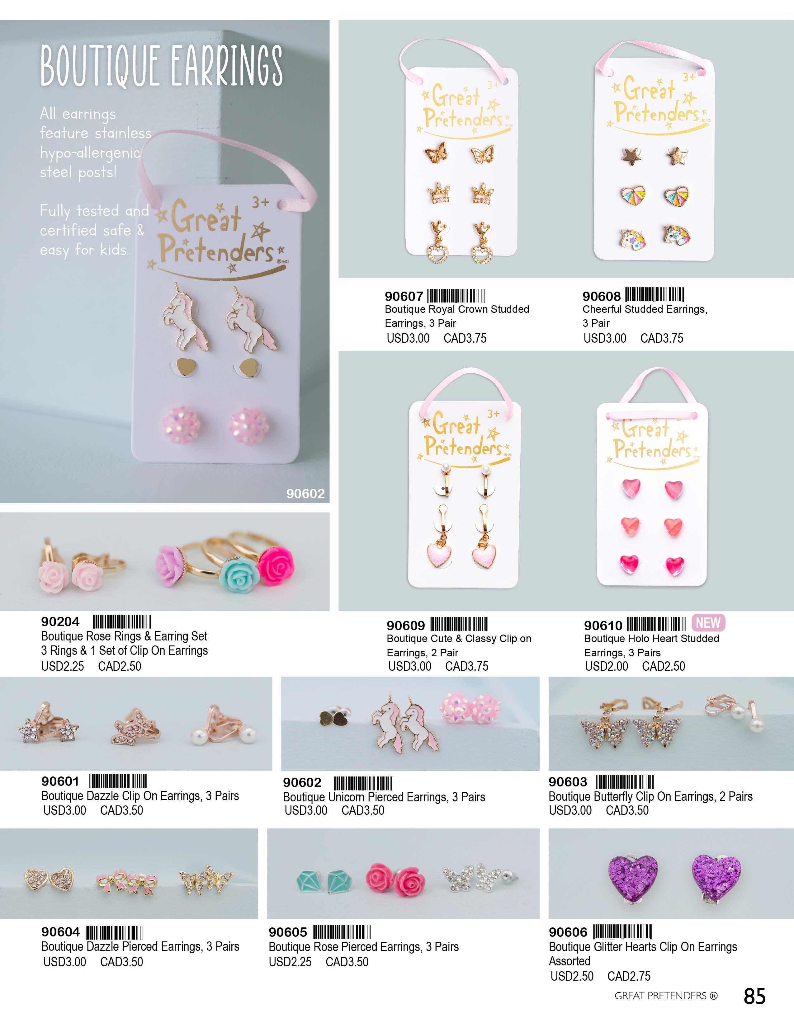 90204 111111111111111111111111111111 BoutiqueRoseRings& EarringSet 3 Rings& 1 Setof ClipOn Earrings USD2.25 CAD2.50 90601 1111111111111111111111 IIIIIIII BoutiqueDazzleClipOn Earrings,3 Pairs USD3.00 CAD3.50 90604 1111111111111111111111 IIIIIIII BoutiqueDazzlePiercedEarrings,3 Pairs USD3.00 CAD3.50 90607111111111111111111111111111111 Boutique Royal Crown Studded Earrings, 3 Pair USD3.00 CAD3.75 90609 1111111111111111111111 IIIIIIII Boutique Cute & Classy Clip on Earrings, 2 Pair USD3.00 CAD3.75 90602 1111111111111111111111 IIIIIIII BoutiqueUnicornPiercedEarrings,3 Pairs USD3.00 CAD3.50 90605 1111111111111111111111 IIIIIIll BoutiqueRosePiercedEarrings,3 Pairs USD2.25 CAD3.50 • J (!;~ 90608 1111111111111111111111 IIIIIIII Cheerful Studded Earrings, 3 Pair USD3.00 CAD3.75 90610111111111111111111111111111111 DI Boutique Holo Heart Studded Earrings, 3 Pairs USD2.00 CAD2.50 90603 1111111111111111111111 Illlllll BoutiqueButterflyClipOn Earrings,2 Pairs USD3.00 CAD3.50 90606 IIIIIJIIIJJlllllllllll11111111 BoutiqueGlitterHeartsClipOn Earrings Assorted USD2.50 CAD2.75 GREATPRETENDERS® 85