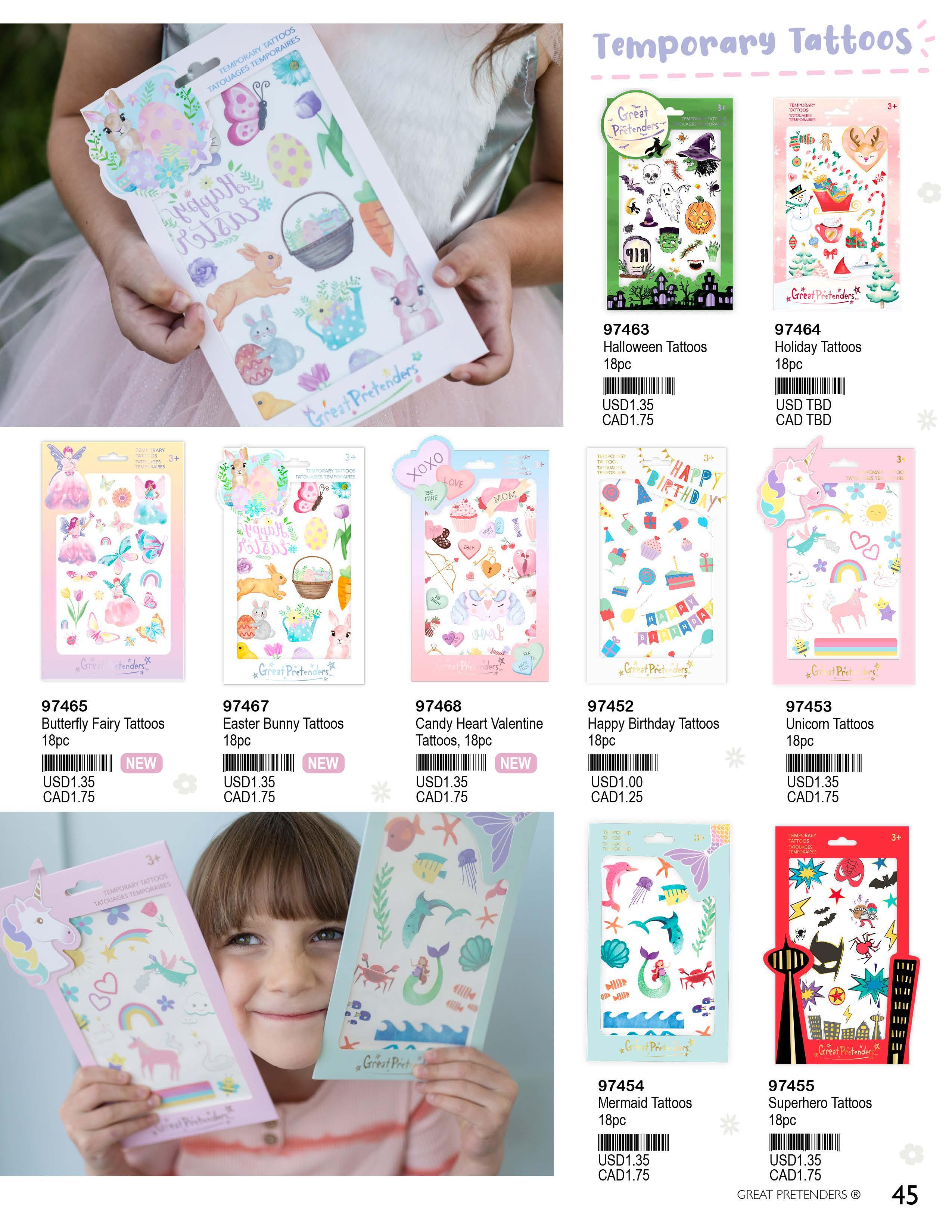 I "1'.fl :;, 97465 ButterflyFairyTattoos 18pc 111111111111111111111111111111£Im USD1.35 CAD1.75 97467 EasterBunnyTattoos 18pc IIIIIIIIIIIIIIIIIIIIIIIIIIIIIICim USD1.35 CAD1.75 97468 CandyHeartValentine Tattoos,18pc 111111111111111111111111111111 £Im USD1.35 CAD1.75 --------97463 HalloweenTattoos 18pc 111111111111111111111111111111 USD1.35 CAD1.75 97452 HappyBirthdayTattoos 18pc 111111111111111111111111111111 USD1.00 CAD1.25 97454 MermaidTattoos 18pc 111111111111111111111111111111 USD1.35 CAD1.75 97464 HolidayTattoos 18pc 111111111111111111111111111111 USDTBD CADTBD 3 "" X TA H RI --~ •• C)c:'.J " Pre •s - . 97453 UnicornTattoos 18pc 111111111111111111111111111111 USD1.35 CAD1.75 97455 SuperheroTattoos 18pc 111111111111111111111111111111 USD1.35 CAD1.75 * GREATPRETENDERS® 4 5