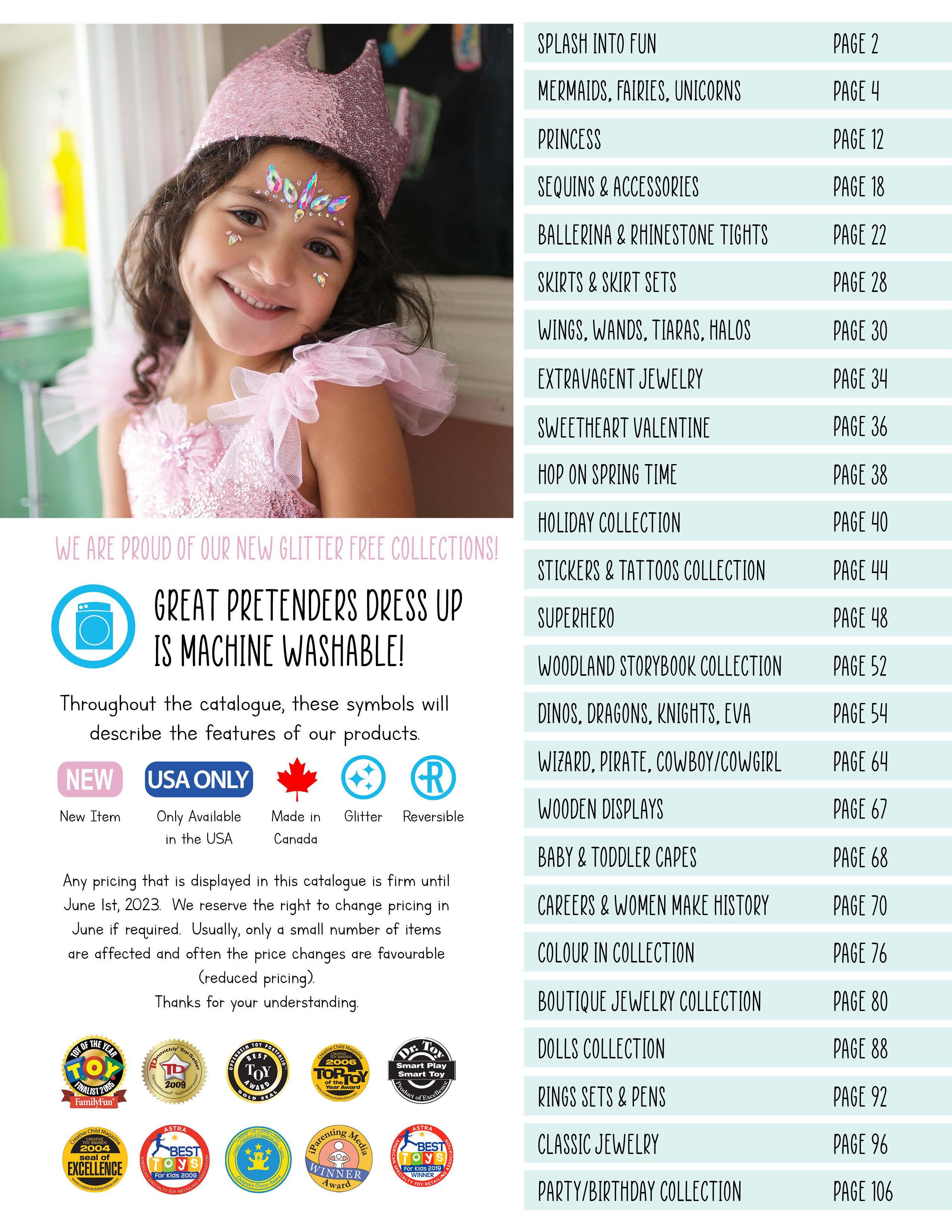 WEAREPROUDOfOURNEWGLITTERFREECOLLECTIONS! la\ GQEATPQETENDEQSDQESS UP \!!I ISMACHINEWASHABLEJ Throughout the ccJtcJlogue,these symbols will describe the fecJtures of our products. mB (§t;J•j~i51 @ ® New Item Only Available Made in Glitter Reversible in the USA Canada Any pricing that is displayed in this catalogue is firm until June 1st, 2023. We reserve the right to change pricing in June if req_uired Usually, only a small number of items are affected and often the price changes are favourable (reduced pricing} Thanks for your understanding (j) • SPLASHINTOFUN PAGE 2 MEQMAIDS.FAIQIES.UNICOQNS PAGE~ PQINCESS PAGE 12 SEQUINS&ACCESSOQIES PAGE 18 BALLEQINA&QHINESTONETIGHTS PAGE 22 S~IQTS&S~IQTSETS PAGE 28 WINGS.WANDS.TIAQAS.HALOS PAGE 30 EXTQAVAGENTJEWELQY PAGE 3~ SWEETHEAQTVALENTINE PAGE 36 HOPONSPQINGTIME PAGE 38 HOLIDAYCOLLECTION PAGE~O STIC~EQS&TATTOOSCOLLECTION SUPEQHEQO WOODLANDSTOQYBOO~COLLECTION DINOS.DQAGONS.~NIGHTS.EVA WllAQD.PIQATE.COWBOY/COWGIQL WOODENDISPLAYS PAGE~~ PAGE ~8 PAGE S2 PAGES~ PAGE 6~ PAGE 67 BABY&TODDLEQCAPES PAGE 68 CAQEEQS&WOMENMAHHISTOQY COLOUQINCOLLECTION BOUTIQUEJEWELQYCOLLECTION DOLLSCOLLECTION QINGSSETS&PENS PAGE 70 PAGE 76 PAGE 80 PAGE 88 PAGE 92 CLASSICJEWELQY PAGE 96 PAQTY/BIQTHDAYCOLLECTION PAGE106
