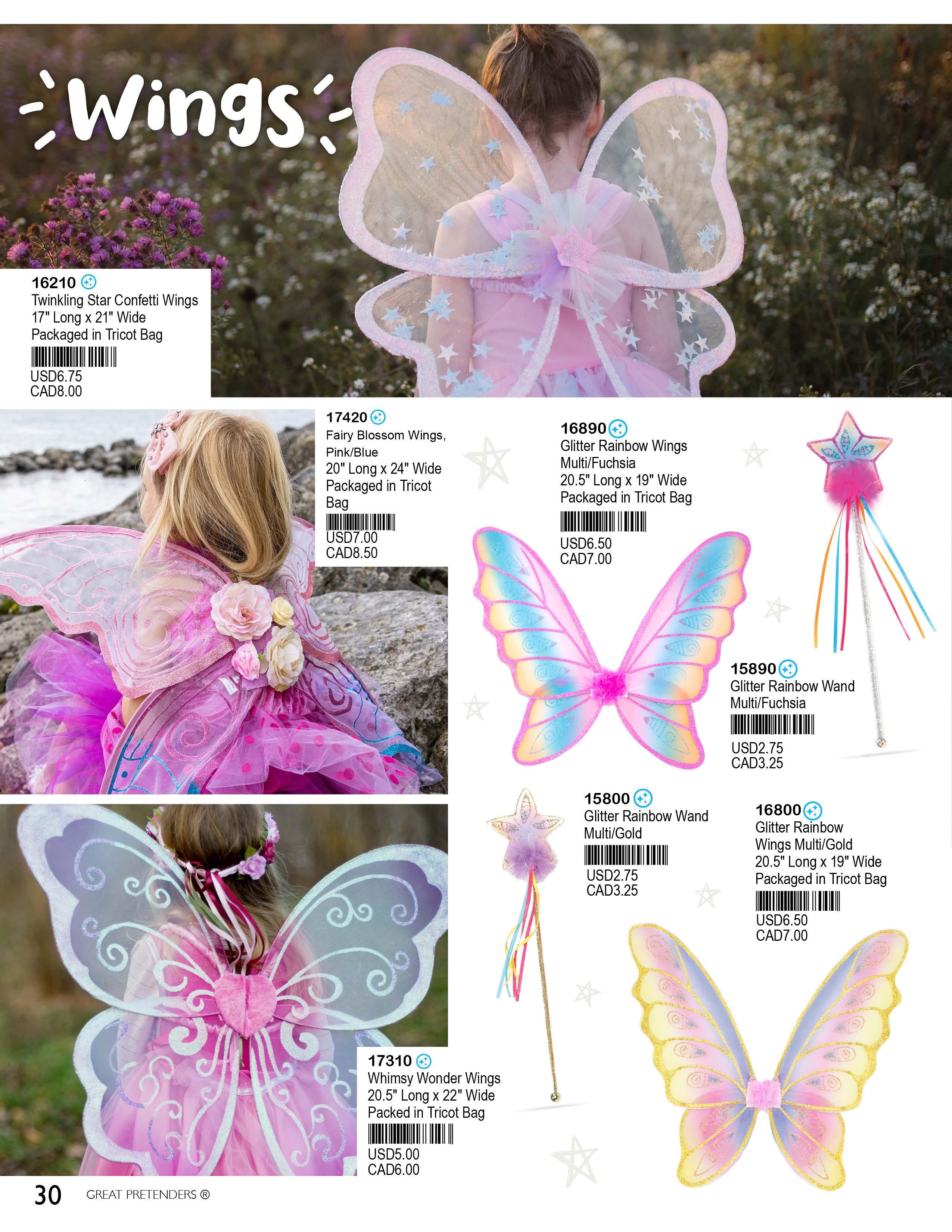 16210@ TwinklingStarConfettiWings 17"Longx 21"Wide Packagedin TricotBag 111111111111111111111111111111 USD6.75 CAD8.00 17420@ Fairy Blossom Wings, Pink/Blue 20" Longx 24"Wide Packagedin Tricot Bag 111111111111111111111111111111 USD?.00 CAD8.50 17310@ WhimsyWonderWings 20.5"Longx 22" Wide Packedin TricotBag 111111111111111111111111111111 USD5.00 :,__.........,..._:...~::...!.__..i._~ _ ___.j CAD6.00 30 GREATPRETENDERS® 16890@ GlitterRainbowWings Multi/Fuchsia 20.5"Longx 19"Wide Packagedin TricotBag 11111111111111111111 II IIIIIIII USD6.50 CAD?.00 15800@ GlitterRainbowWand Multi/Gold 111111111111111111111111111111 USD2.75 CAD3.25 15890@ GlitterRainbowWand Multi/Fuchsia llllllllllllllllllllll llllllll USD2.75 CAD3.25 16800@ GlitterRainbow WingsMulti/Gold 20.5"Longx 19"Wide Packagedin TricotBag 111111111111111111111111111111 USD6.50 CAD?.00