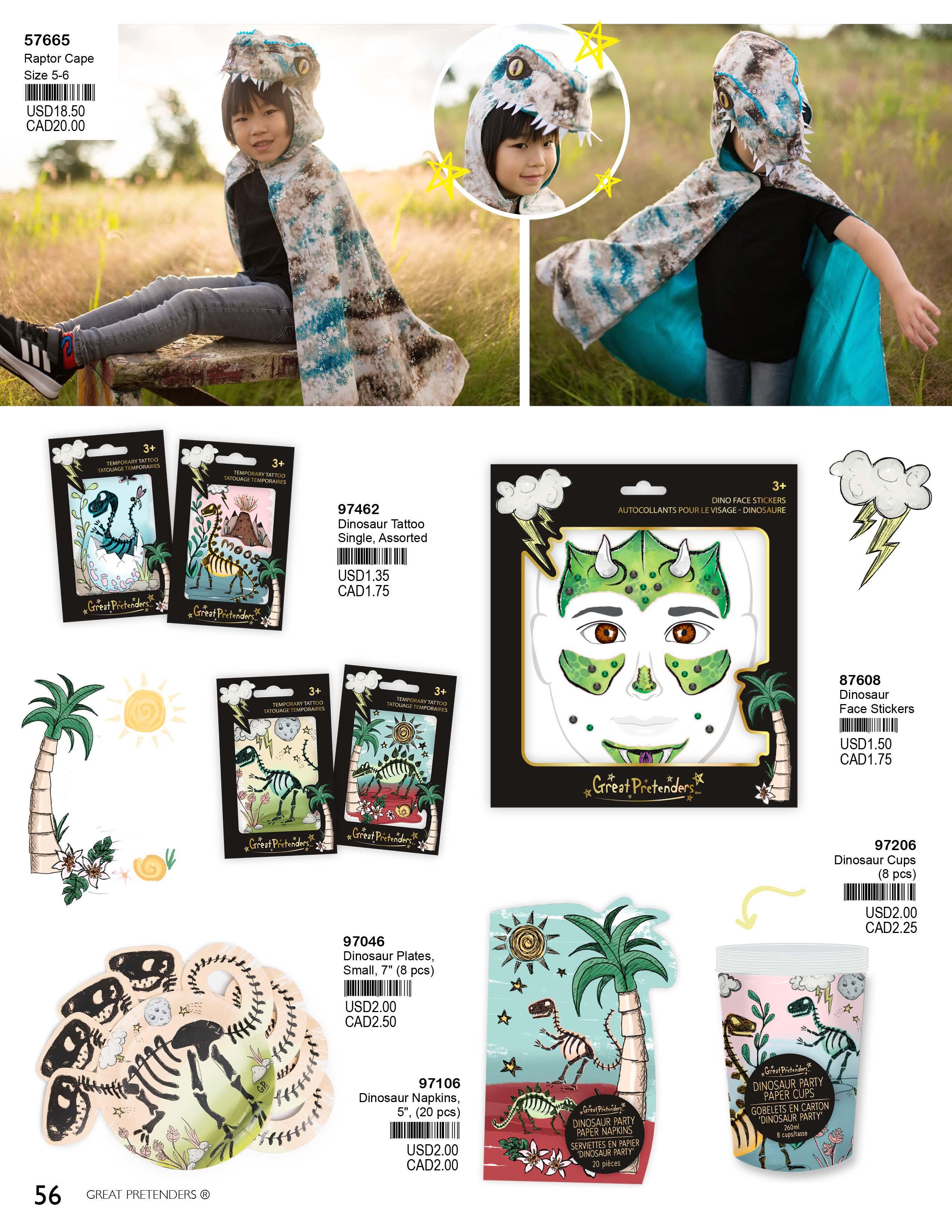 57665 Raptor Cape Size 5-6 111111111111111111111111111111 USD18.50 CAD20.00 ~"·#ti ..,'.· . Fi ~,, 56 GREATPRETENDERS® 97462 Dinosaur Tattoo Single, Assorted 111111111111111111111111111111 USD1.35 CAD1.75 97046 Dinosaur Plates Small, 7" (8 pcs' 111111111111111111111111111111 l USD2.00 CAD2.50 . 97106 Dinosaur Napkins 5", (20 pcs) 111111111111111111111111111111 USD2.00 CAD2.00 87608 Dinosaur Face Stickers 111111111111111111111111111111 USD1.50 CAD1.75 . 97206 Dinosaur Cups (8 pcs) 111111111111111111111111111111 USD2.00 CAD2.25