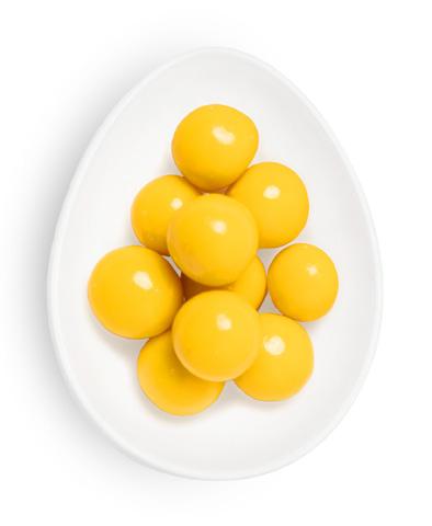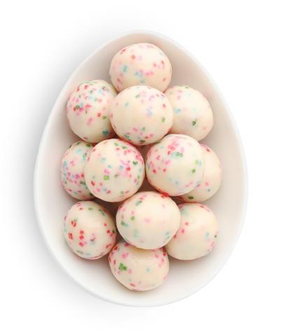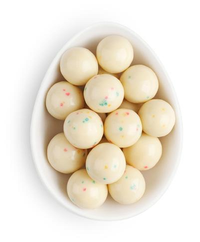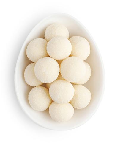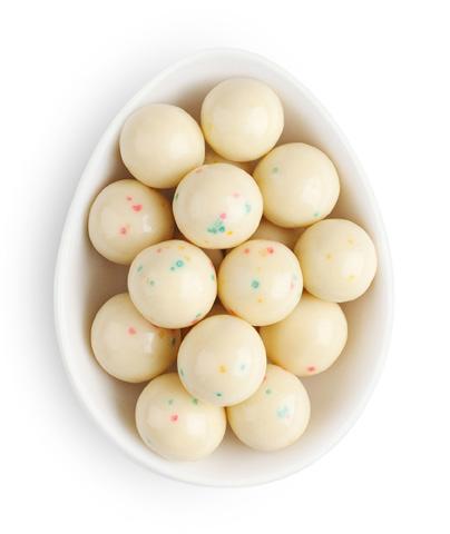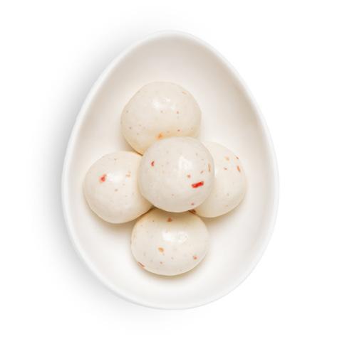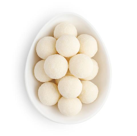 A crunchy shell of French white chocolate and roasted almond pieces with a creamy center.