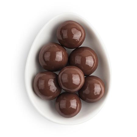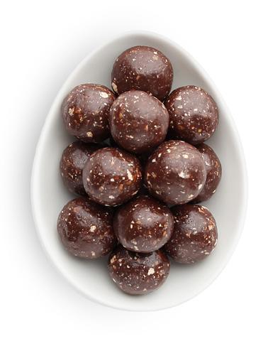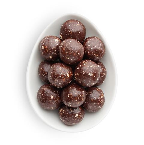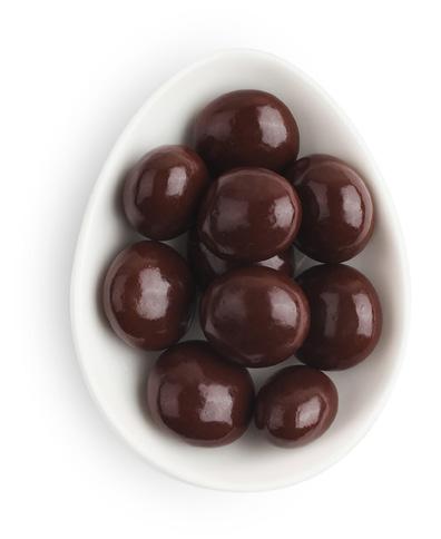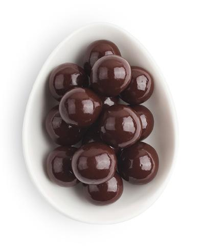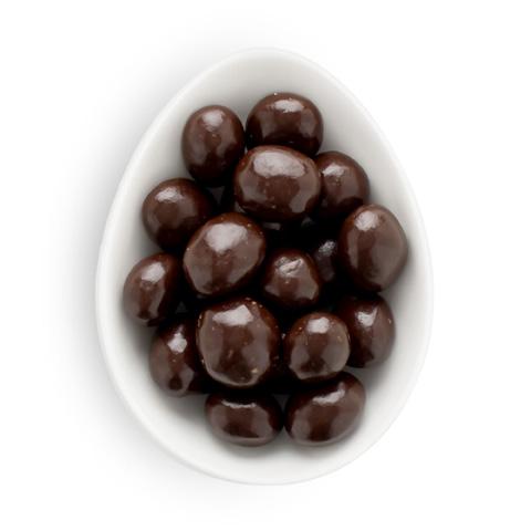 A crunchy shell of French dark chocolate and roasted almond pieces with a soft center.