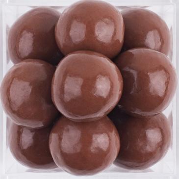 A crunchy shell of French milk chocolate and roasted almond pieces with a velvety center.