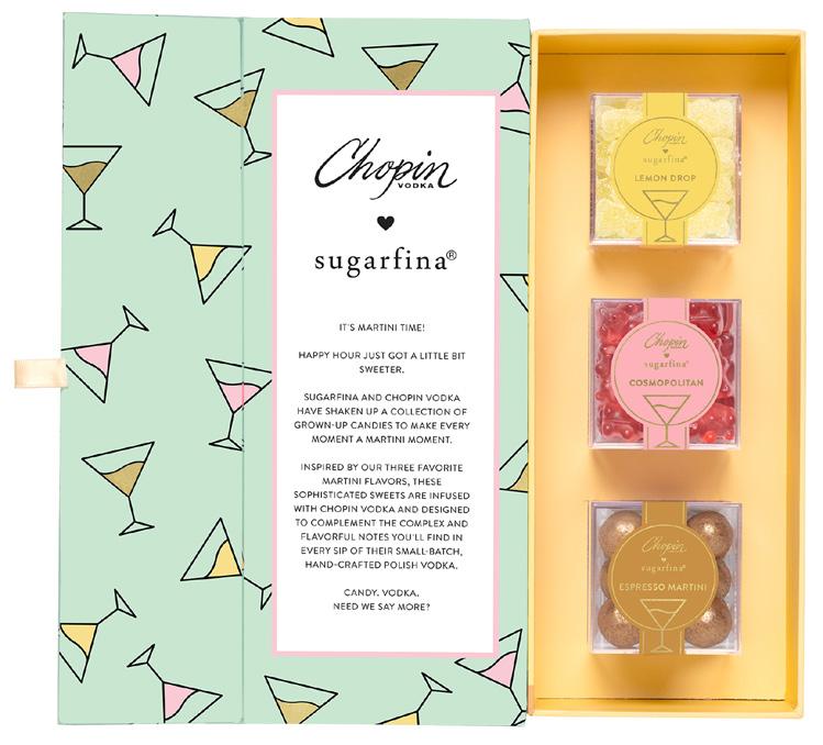 Sugarfina and Chopin have teamed up to elevate your happy hour. Toast to classic cocktail-inspired candies infused with Chopin Vodka in fun and indulgent flavors: Lemon Drop, Dirty Martini, and Espresso Martini. Cheers to your martini moment!
