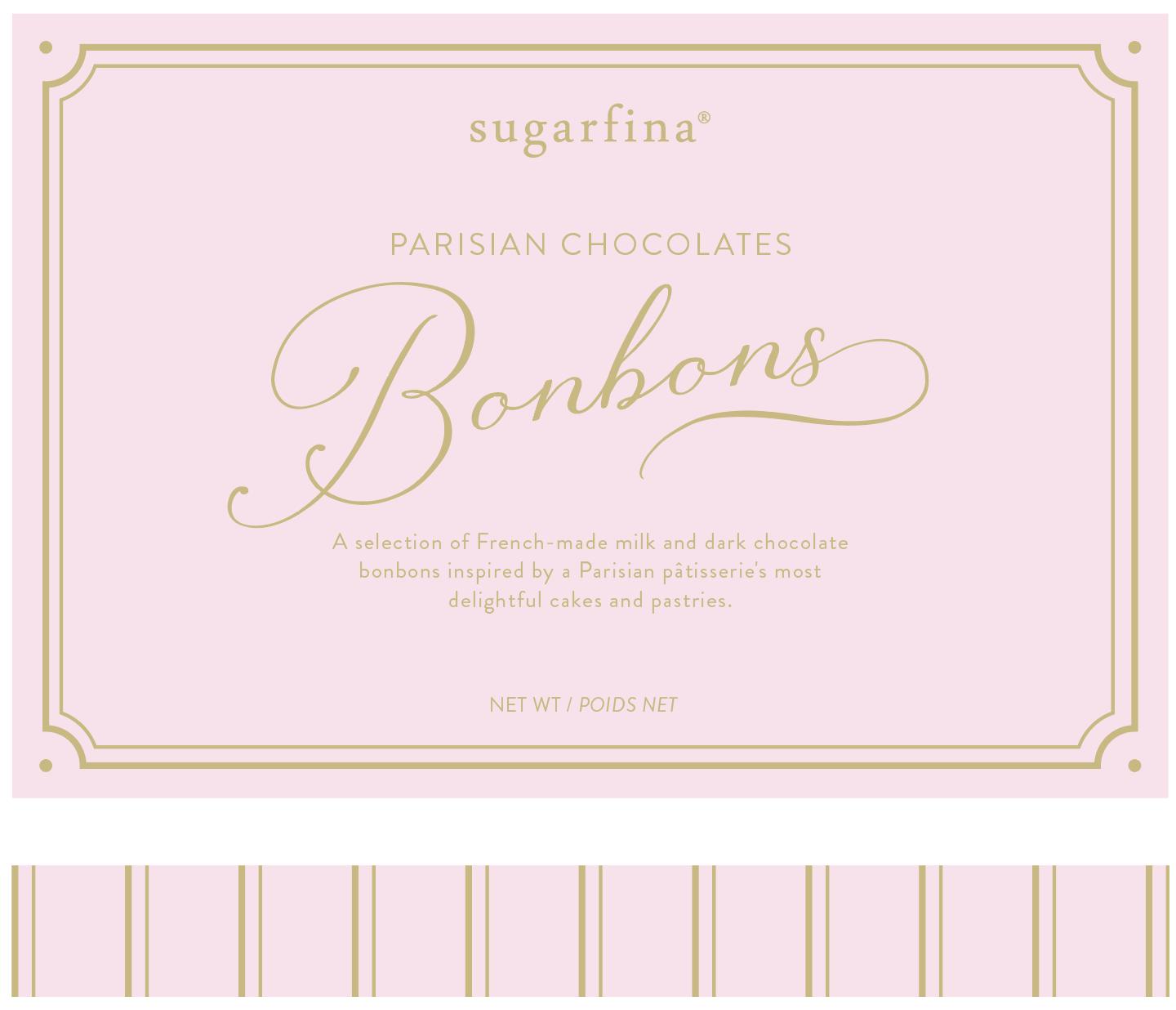 A selection of French-made milk and dark chocolate bonbons inspired by a Parisian pâtisserie's most delightful cakes and pastries.