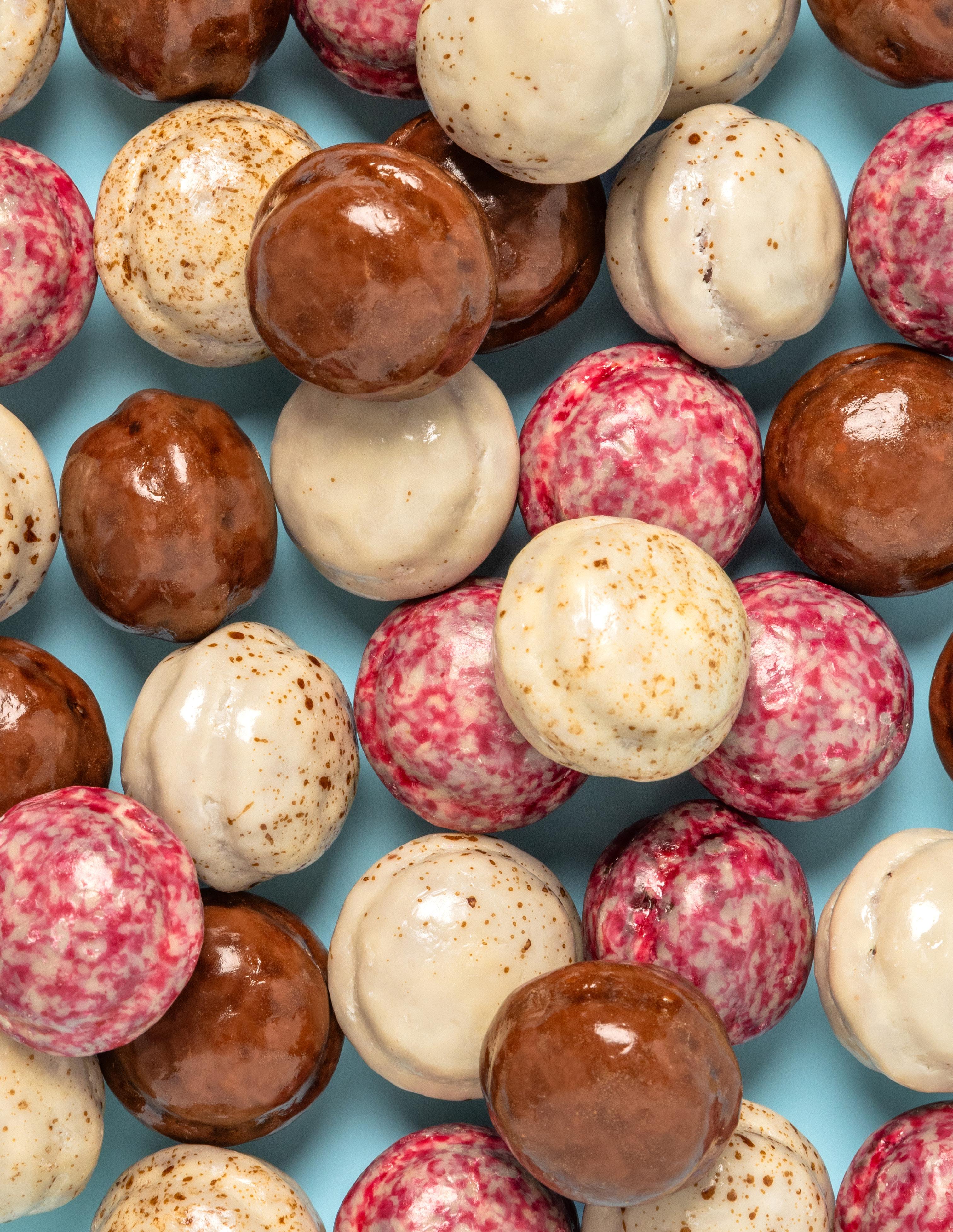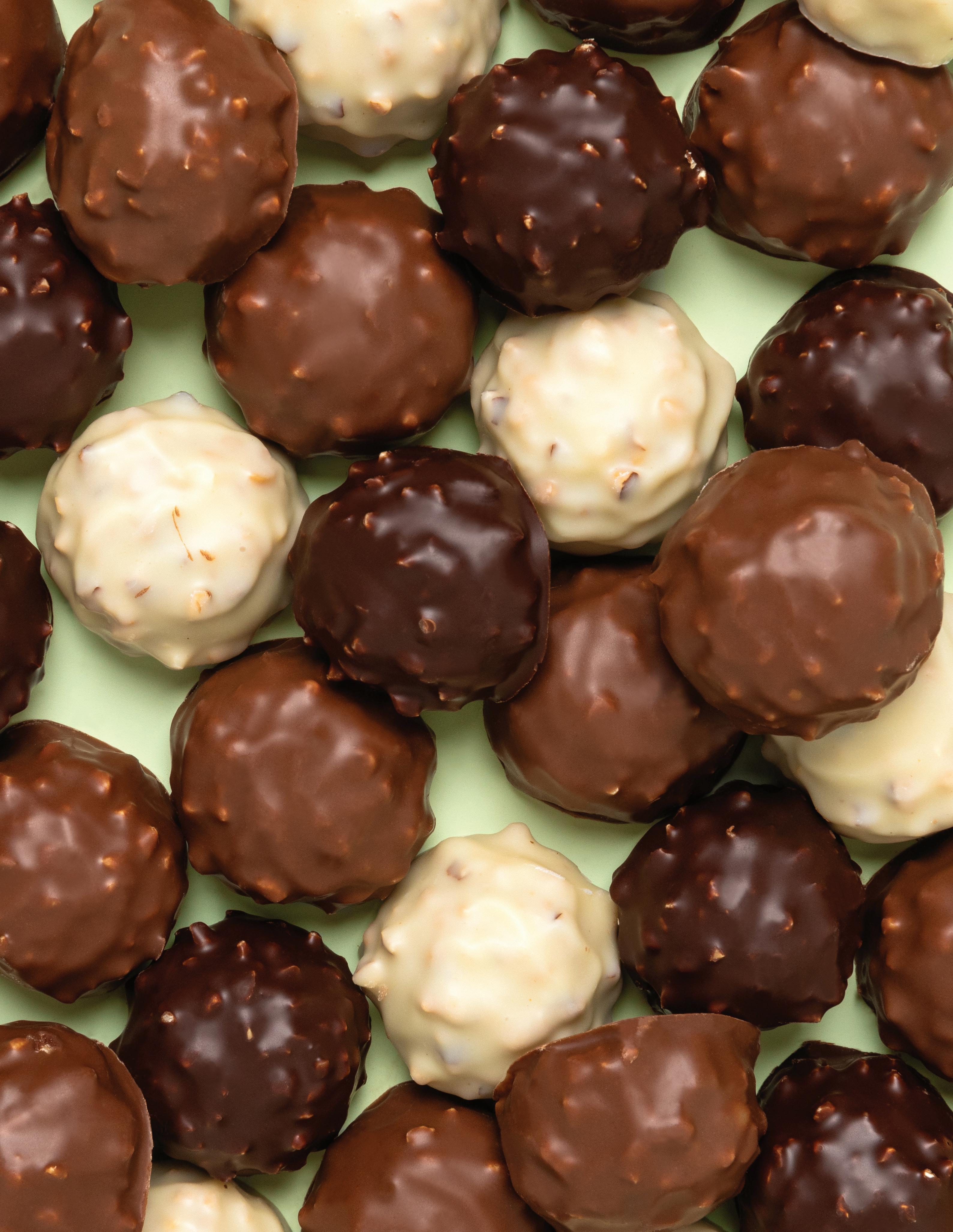 An assortment of Paris' finest rochers in the flavors of Milk Hazelnut Praliné, Dark Hazelnut Praliné, and White Almond Praliné.