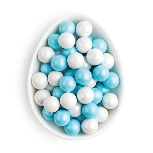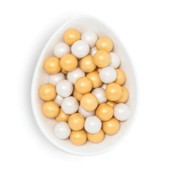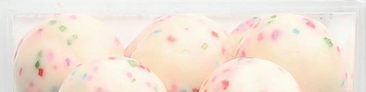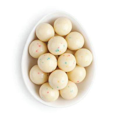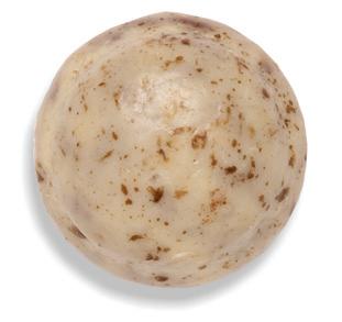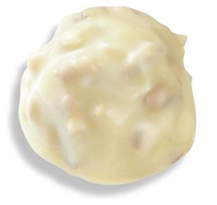 A crunchy shell of French white chocolate and roasted almond pieces with a creamy center.